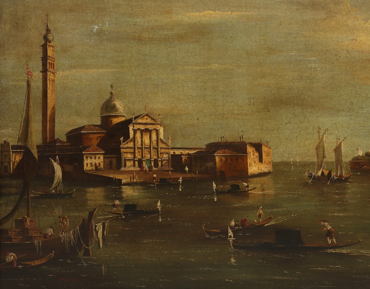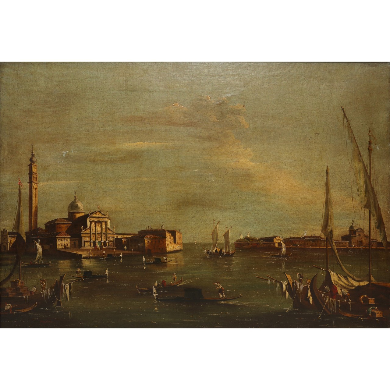 Vittore Zanetti Zilla (Venezia 1864 - Milano 1946) - L'isola di San Giorgio Maggiore con la punta della Giudecca, Venezia h cm 70X100 in cornice h cm 84X113 Il dipinto è una rielaborazione, di stile ben più netto e calligrafico, del famoso modello di veduta con l'Isola di San Giorgio realizzato dal veneziano Francesco Guardi nella seconda metà del XVIII sec.