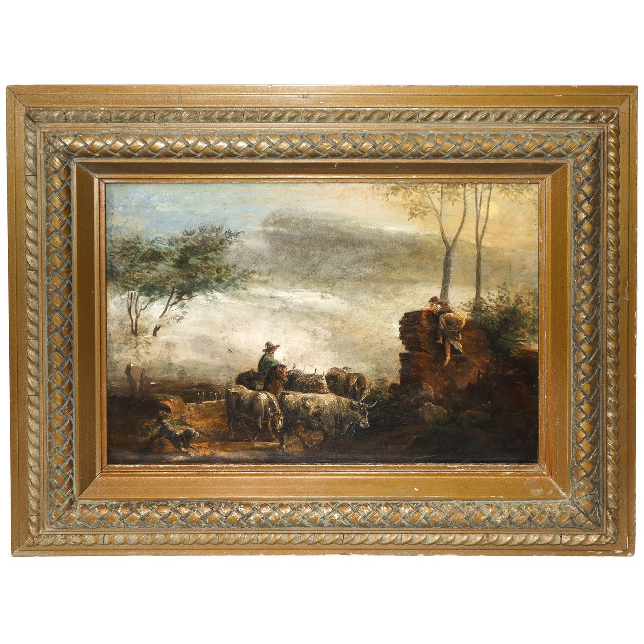 Bovaro con tori, Fine 19° /20° secolo h cm 29X42 in cornice h cm 47X60 olio su tavola