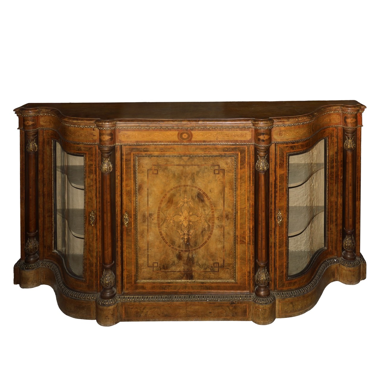 Lotto 106 | Credenza bassa Vittoriana sportello centrale ai lati sportelli in vetro bombato in radica di noce, England 19° secolo