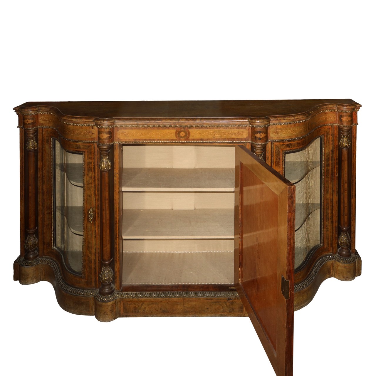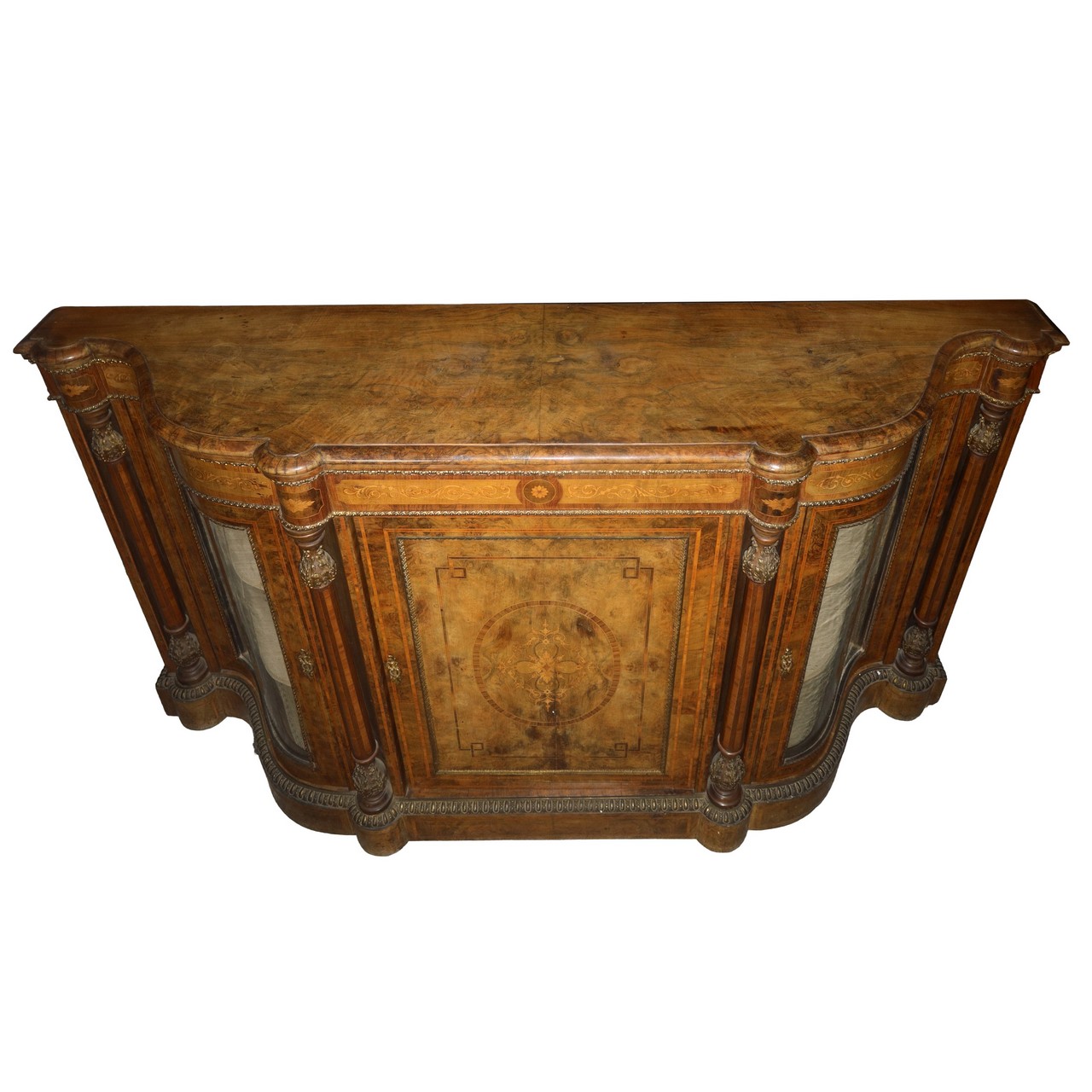 Credenza bassa Vittoriana sportello centrale ai lati sportelli in vetro bombato in radica di noce, England 19° secolo