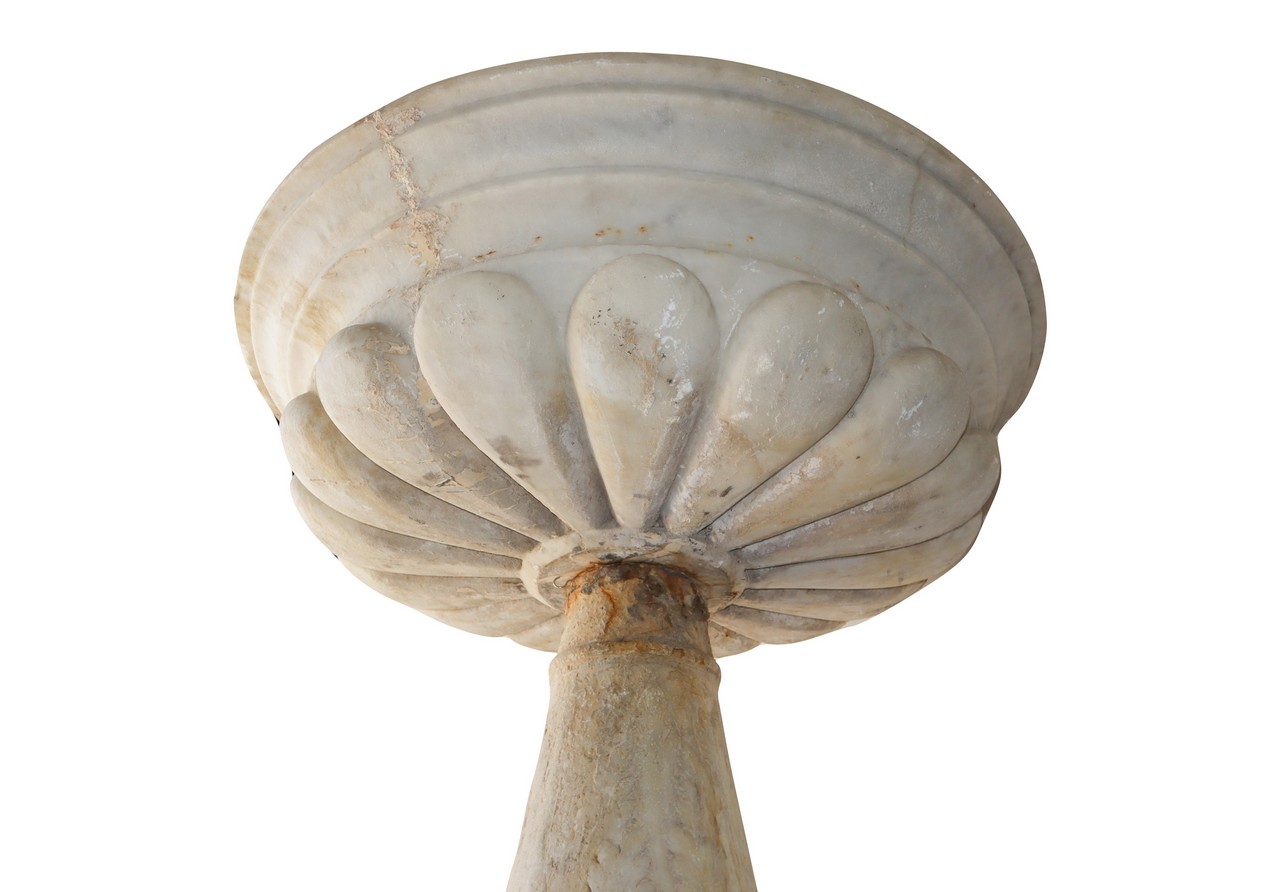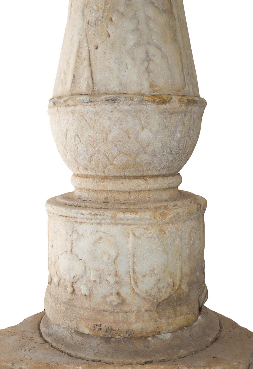 Acquasantiera in marmo bianco, 17° secolo h cm 137 x cm 86, base cm 65 x cm 52 Presenti rotture, incollature e mancanze sul piatto