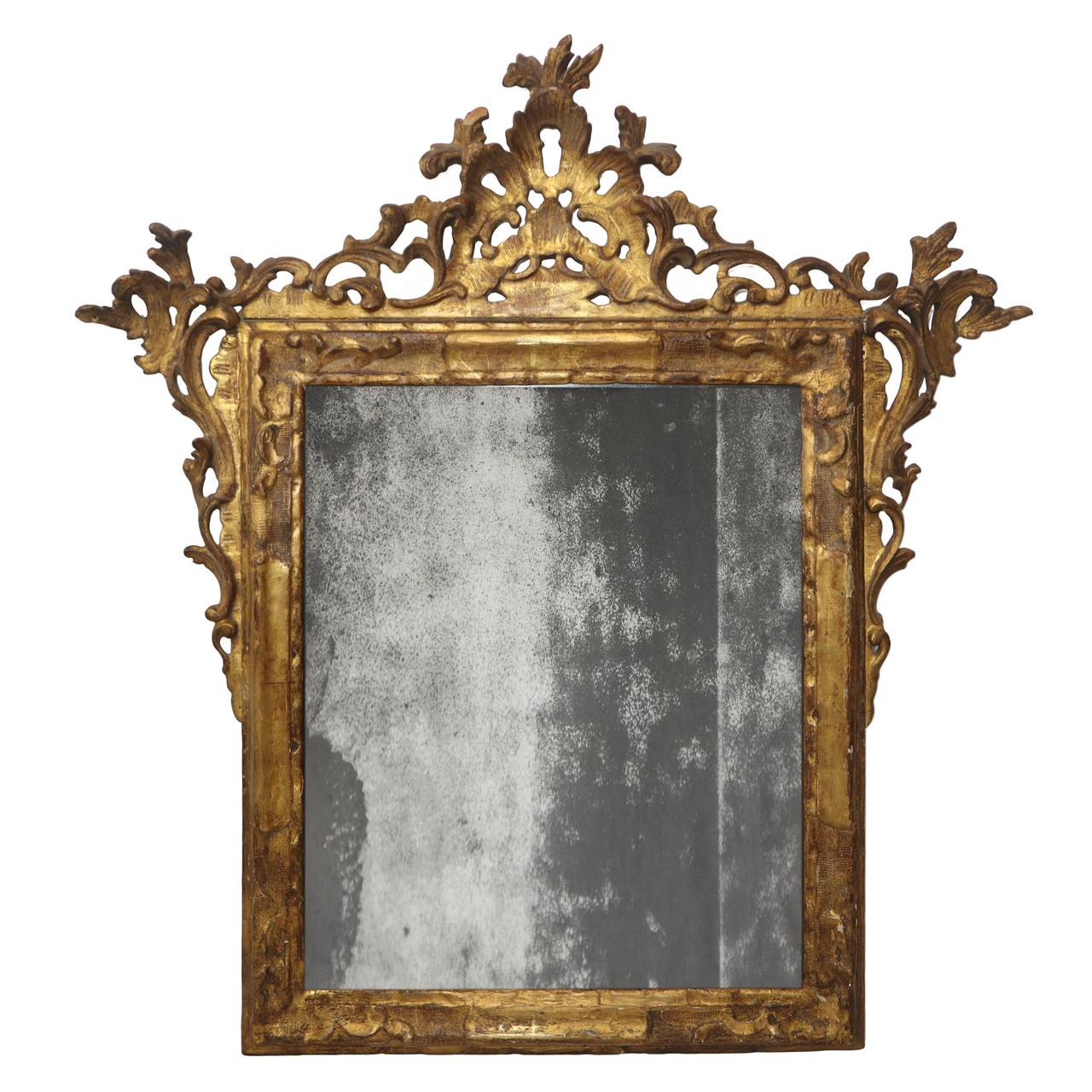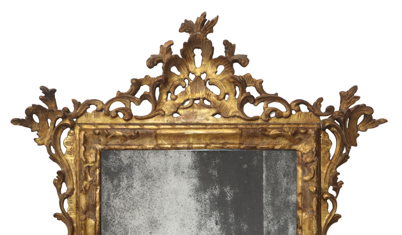 Specchiera in legno dorato a foglia con in testa cimasa, 18° secolo