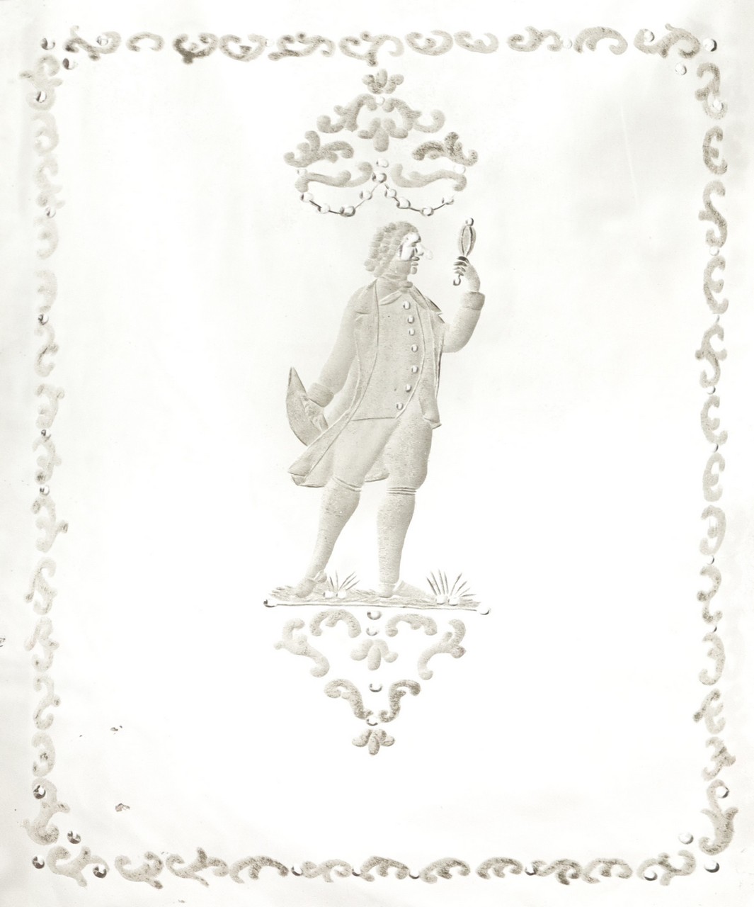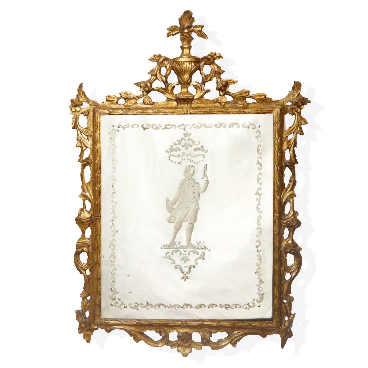Lotto 153 | Specchiera veneziana in cornice dorata a foglia con specchio al mercurio bulinato con personaggio carnascialesco al centro, Venice 18° secolo