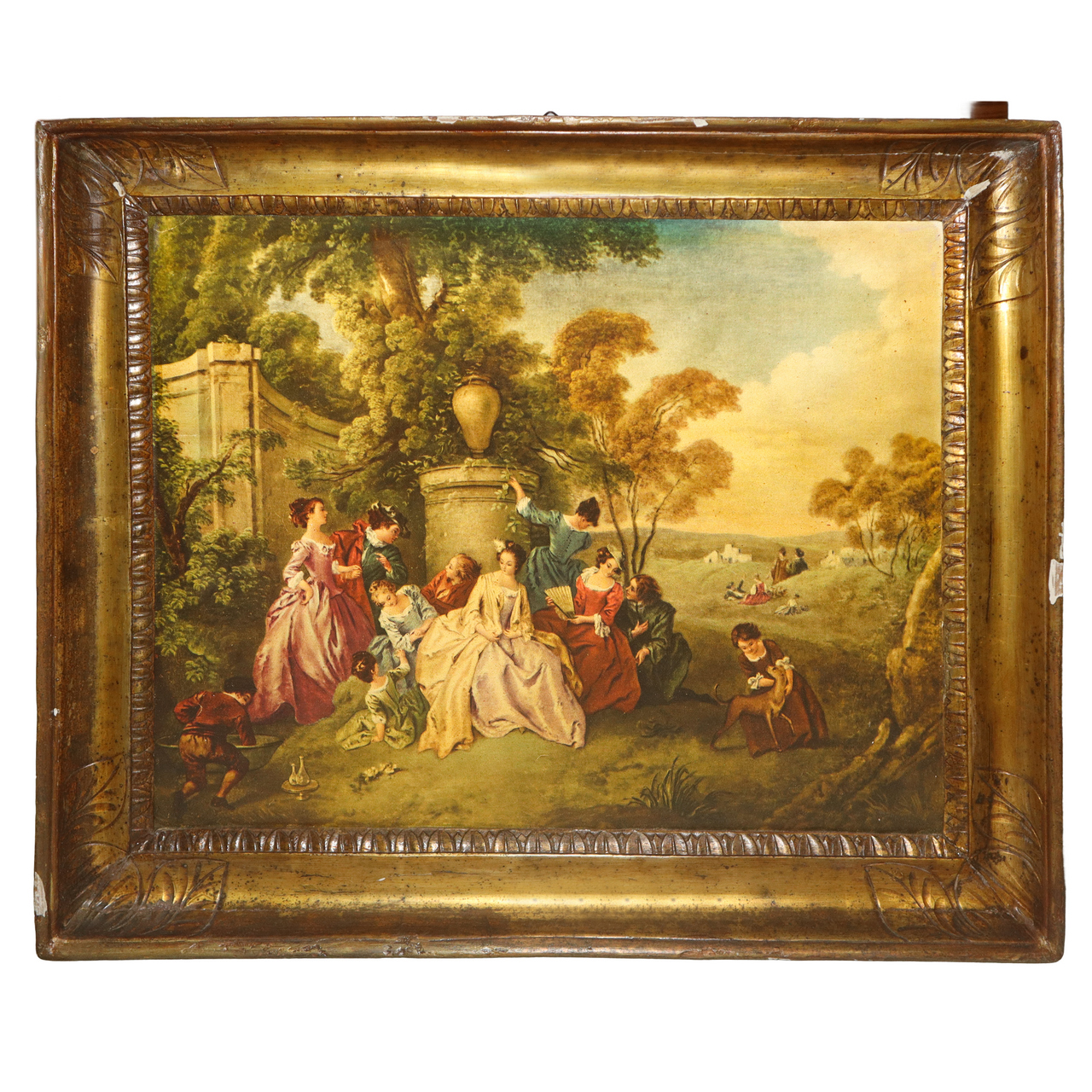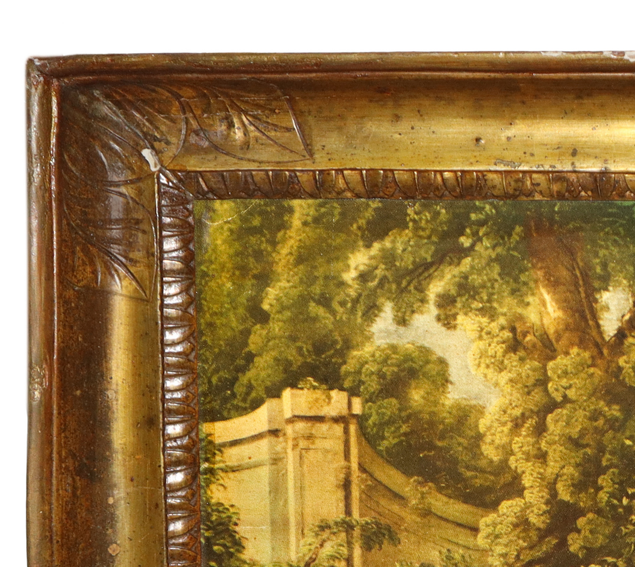 CORNICE IMPERO DORATA ARGENTO E MISTURA CON STAMPA, SICILY primi 19° secolo MISURE INTERNE: H CM 53x44 MISURE ESTERNE: H CM 62x53 BULINATA AGLI ANGOLI BORDO INTERNO CON FOGLIA D'ACANTO LANCEOLATA