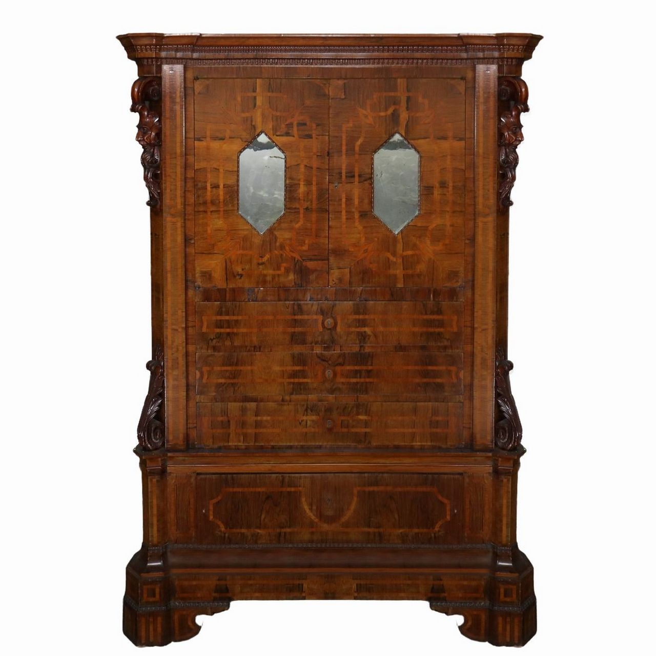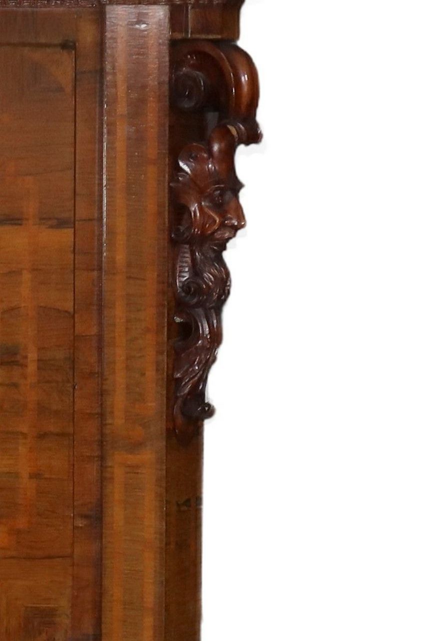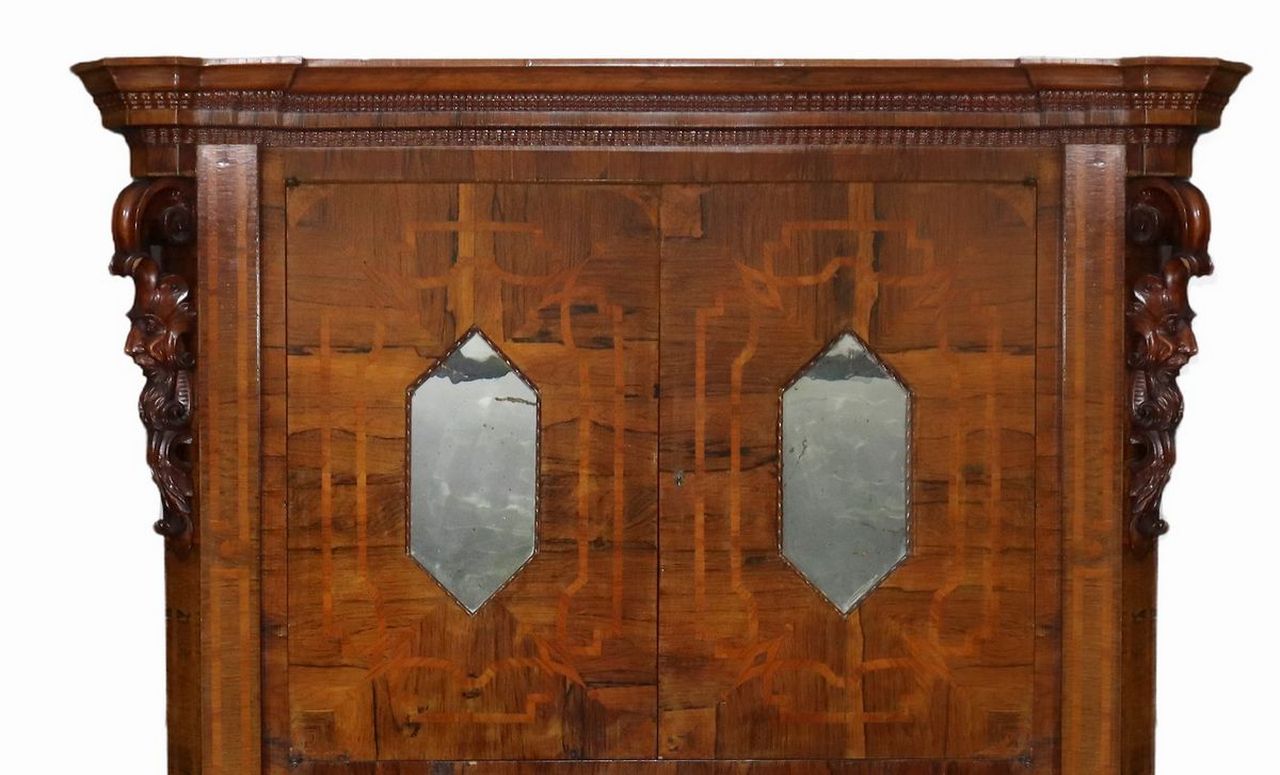 Piccola Schiffonier , 19° secolo Sicily h cm 178 x 125 x 57 Con inserti di Boise de rose, corpo unico parte superiore a due sportelli con specchi centrali a losanga, parte inferiore con tre cassetti più cassetto alla base più grande ,sculture con mascheroni intagliati a foglie ai lati, piedi a mensola.