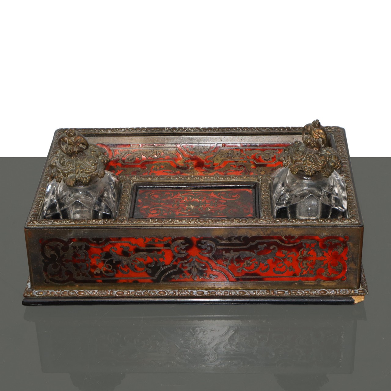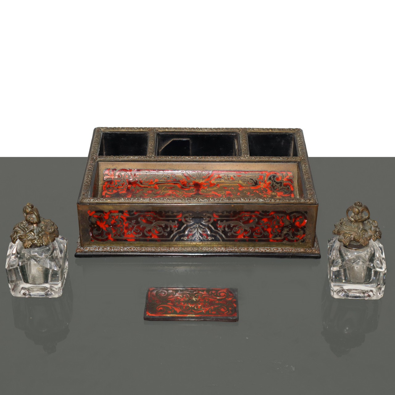 Calamaio Napoleone III lastronato in ottone, cornici e tappi in bronzo dorato, France 1850 cm 25x16,5 Minime mancanze di laccatura
