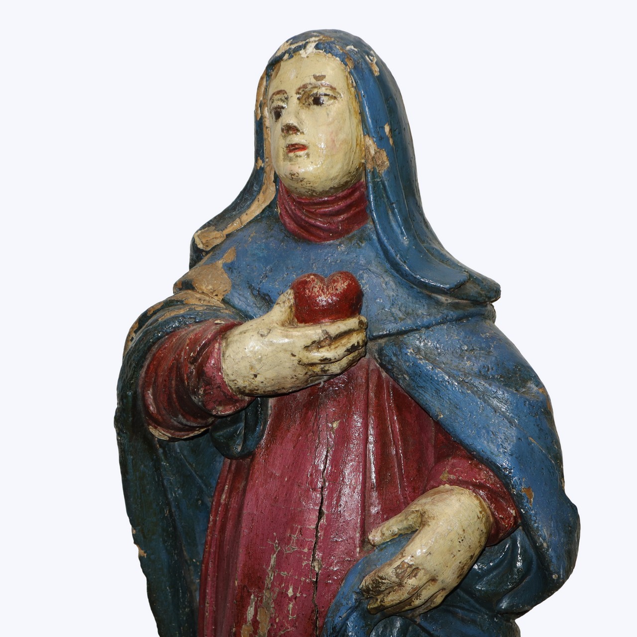 Madonna in preghiera, scultura lignea dipinta policroma, 18° secolo h cm 78 Mancanze