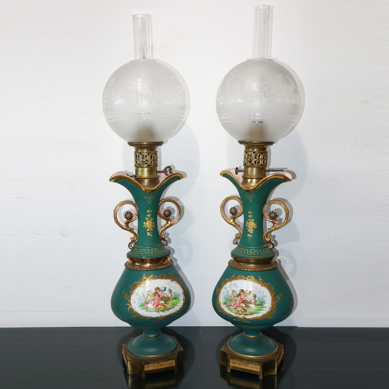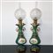 Coppia di lumi in porcellana verde con disegno floreale al centro e boccia a palla in vetro