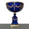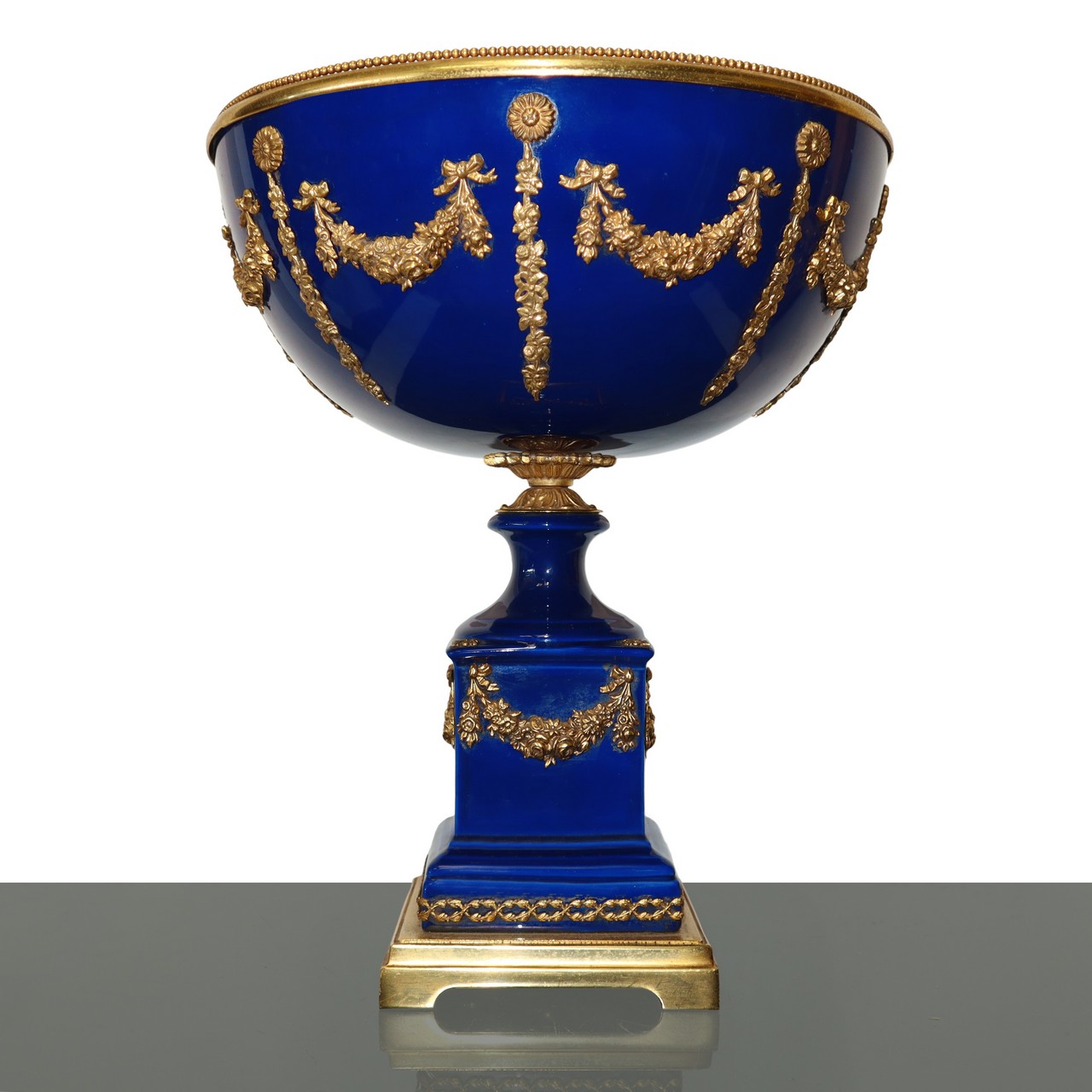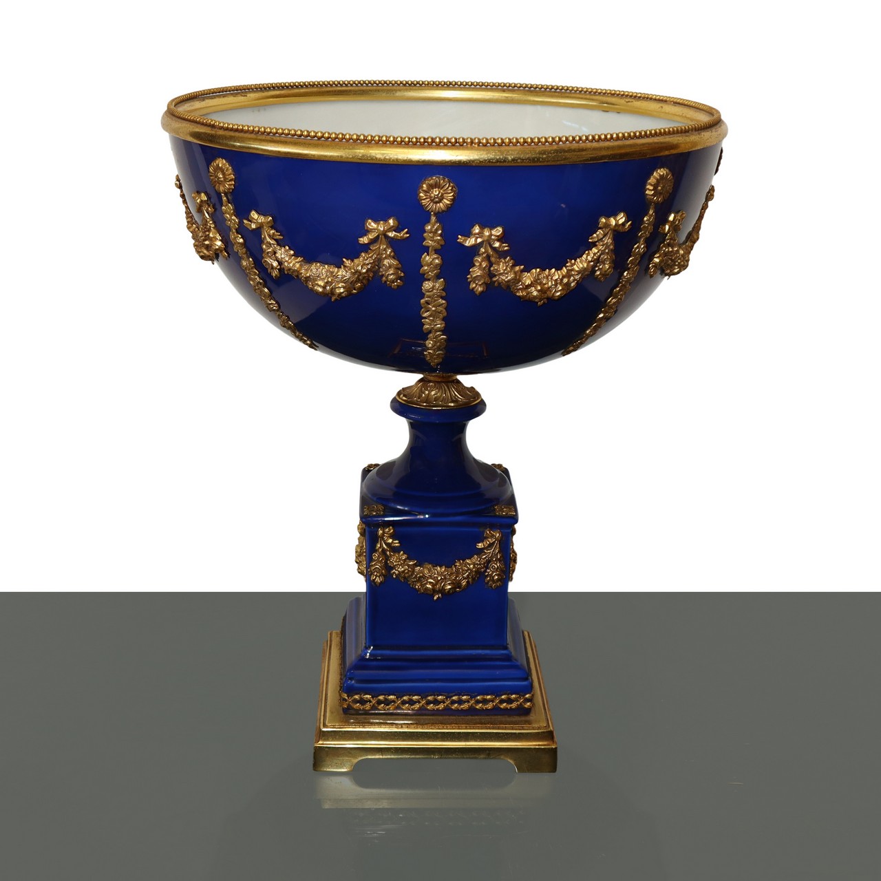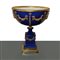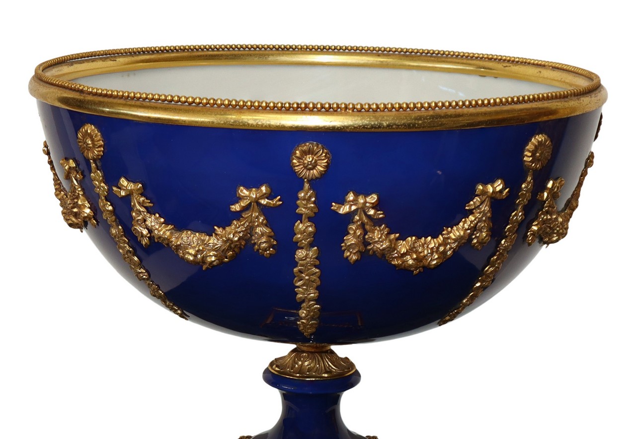 Coppa centrotavola in porcellana blu con applicazioni a ghirlanda in metallo dorato, primi 20° secolo h cm 39