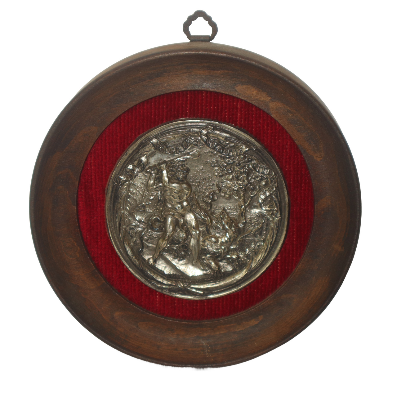 N°3 Placche rotonde in argento 925 entro cornice in legno con scene raffigurante Ercole placca h cm 9X9 in cornice h cm 14,5X14,5 N°2 Placche raffigurante Ercole e il drago, 1 placca raffigurante Ercole