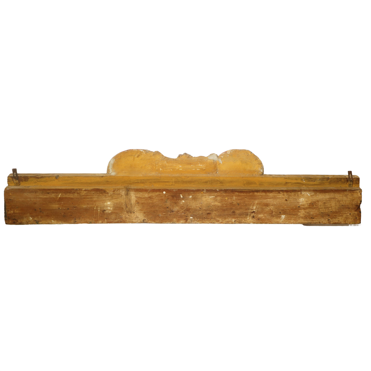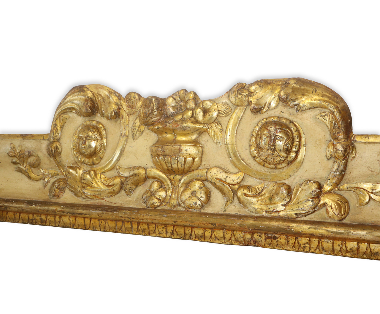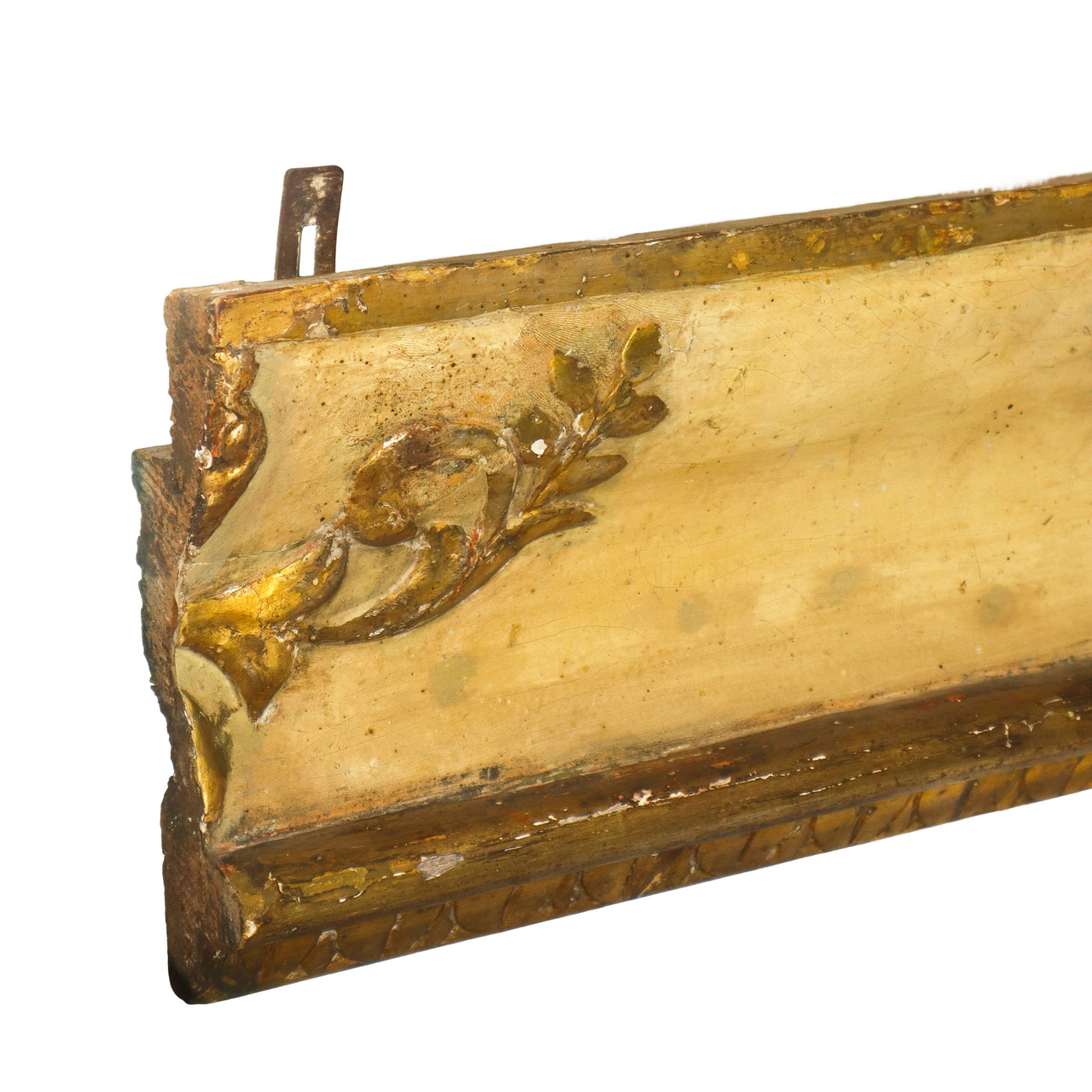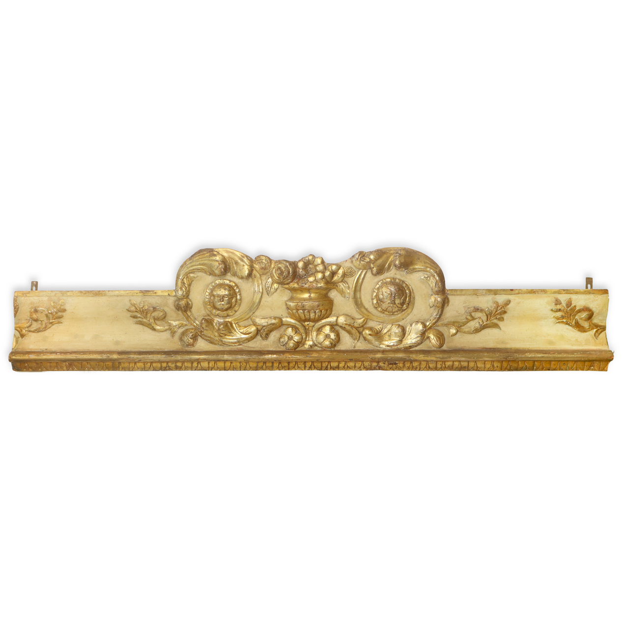 Frammento ligneo laccato e dorato intagliato e sbalzato a grandi ghirlande e motivi floreali, 18° /19° secolo h cm 27 base cm 130 Base con foglie lanceolate