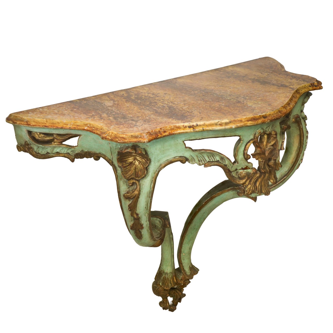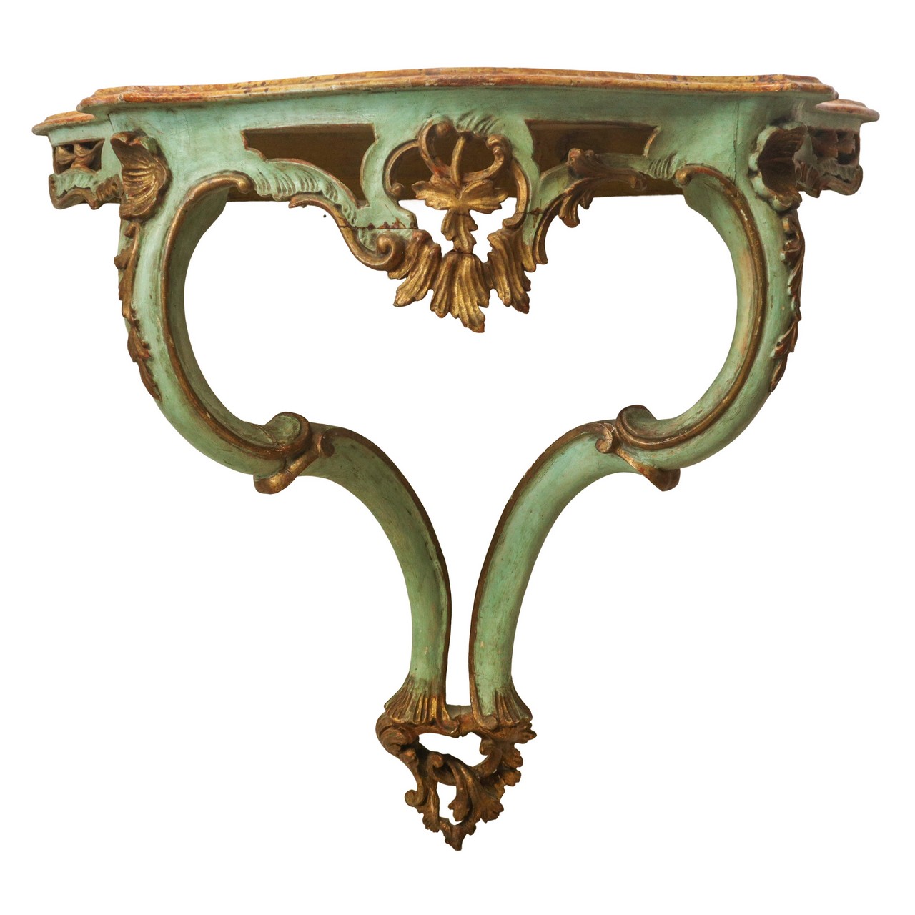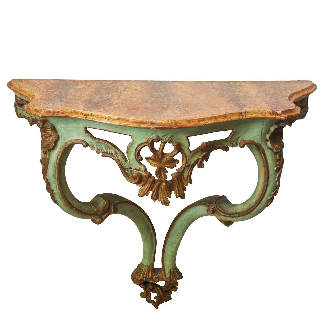 Consolle da muro laccata verde e dorata, 18° secolo h cm 85X79X49