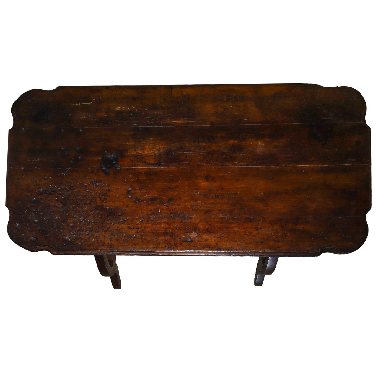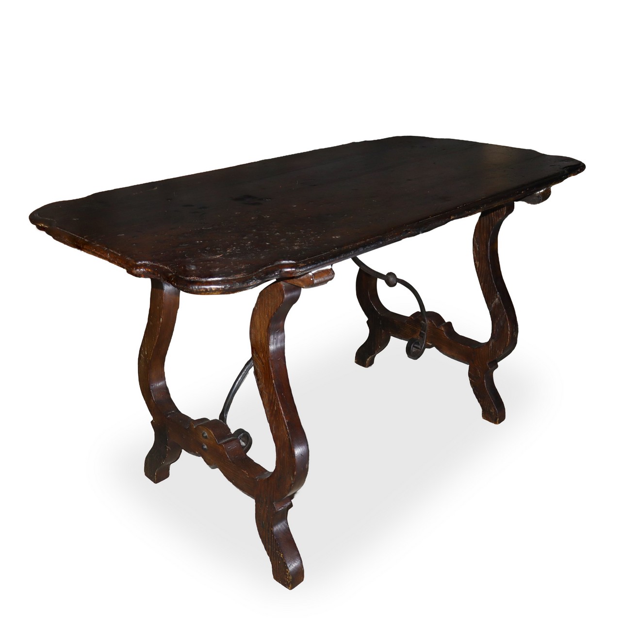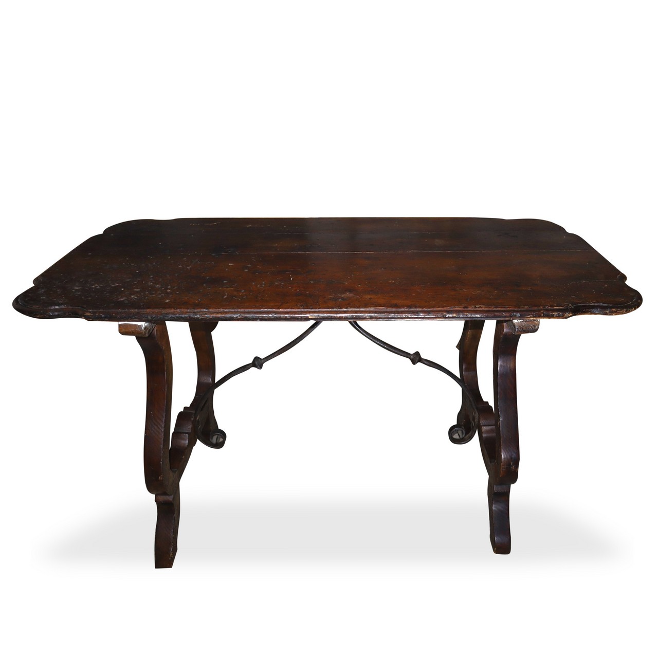 Tavolo fratino in legno di noce con piano sagomato a becco di civetta, 18° secolo cm 78x136x69 Piano sorretto da sostegno in ferro battuto.Piano sorretto da sostegno in ferro battuto.