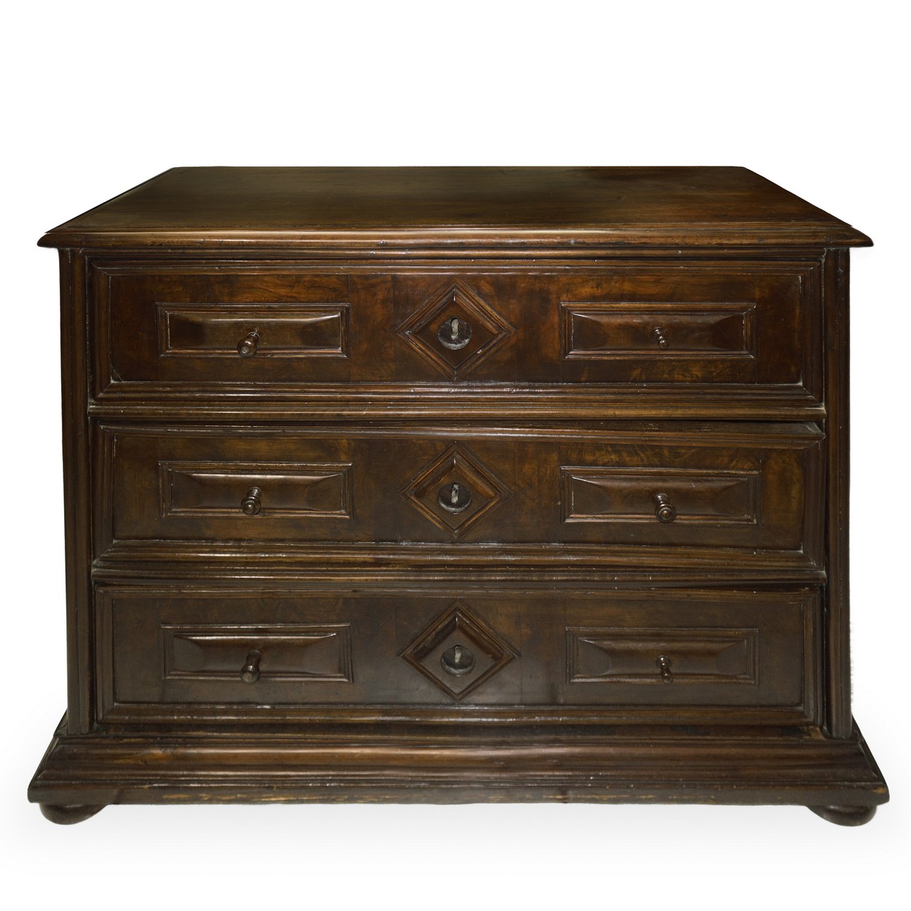 Cassettone a 3 cassetti bugnati e scolpiti a rettangolo ai lati e a losanga al centro con bocchetta chiara, piedi a cipolla schiacciata. , 17° secolo h cm 87,5X108X51