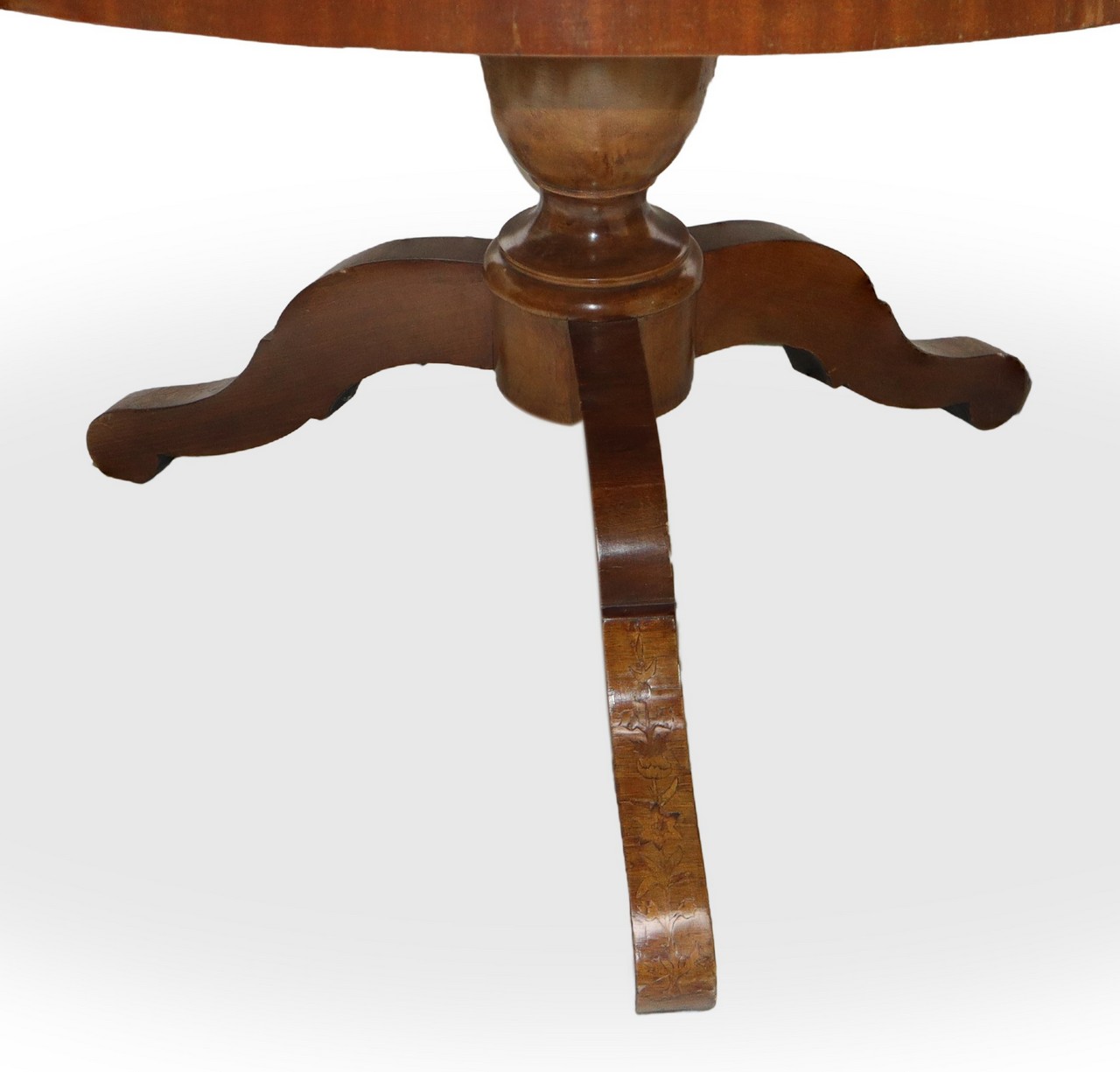 Tavolo rotondo con intarsi floreali al piano colorati in legni vari., primi 20° secolo H cm 81x135 Piede a tre razze con intarsi.Piede a tre razze con intarsi.
