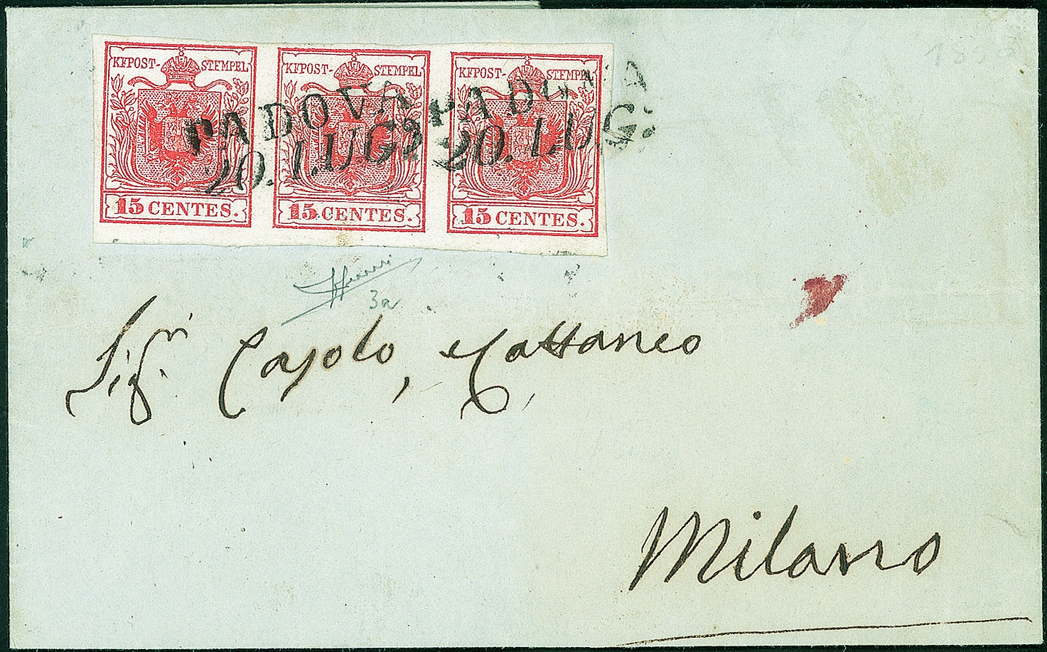 Antichi Stati Italiani - Lombardo Veneto - Lettera da PadovaLettera da Padova del 20.7.1850 per Milano affrancata con striscia di tre del 15 cent prima tiratura carta a mano (3a) - cert. Sorani