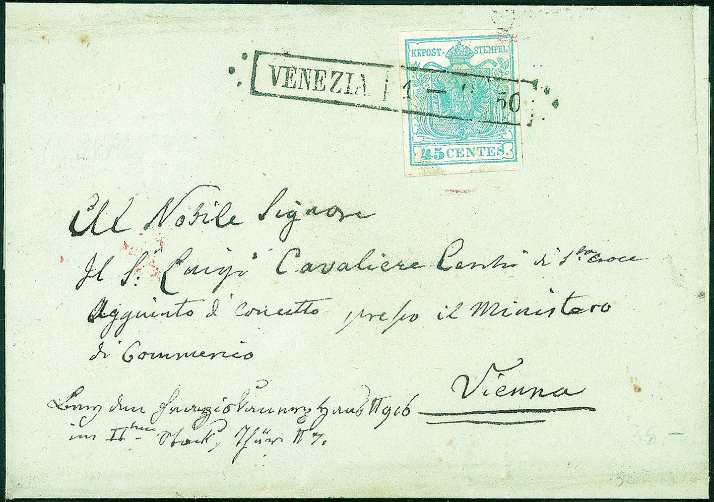 Lettera da Venezia (R50 P.ti 5) del 1.9.1850 per Vienna 8Austria) affrancata con 45 cent primo tipo prima tiratura (10a)