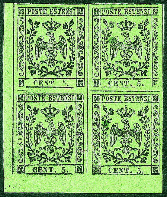 Antichi Stati Italiani - Modena - 1855 - Quartina del 5 cent (8a cat.21000)Quartina del 5 cent verde oliva (8a cat.21000) - angolo di foglio - doppia stampa con primo esemplare senza punto dopo cent - gomma originale nella coppia superiore e integra in quella inferiore - fresca e splendida - firma ED