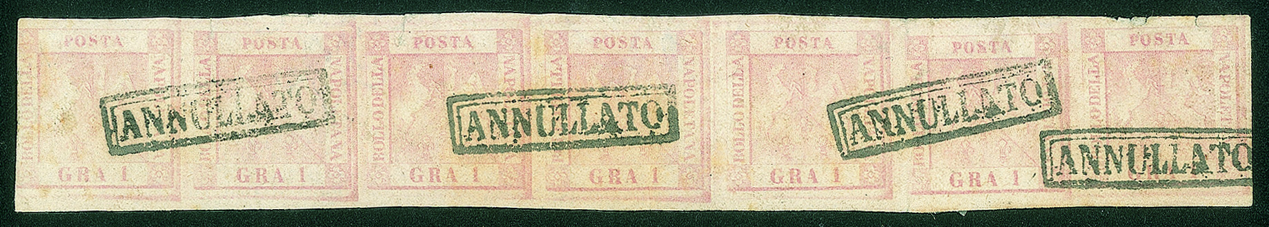 Lotto 12 | Antichi Stati Italiani - Napoli - 1858 - Striscia di sette esemplari del 1 grano rosa chiaro (3 cat.9000 stimato 27000)