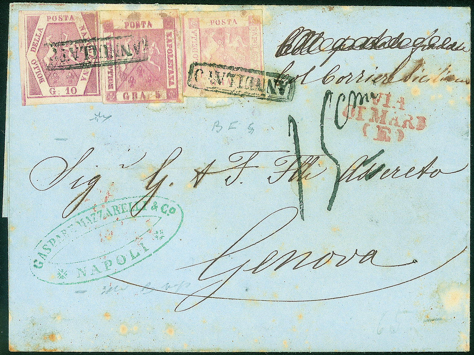 Composta da 1 grano rosa chiaro + 5 grana rosa brunastro con doppia incisione completa + 10 grana rosa brunastro (3 + 8 + 10) da Napoli 12 MAR.58 con a lato il bollo rosso su tre righe 'Via di Mare (E)' diretta a Genova e tassata a tampone 15 centesimi - firma Chiavarello