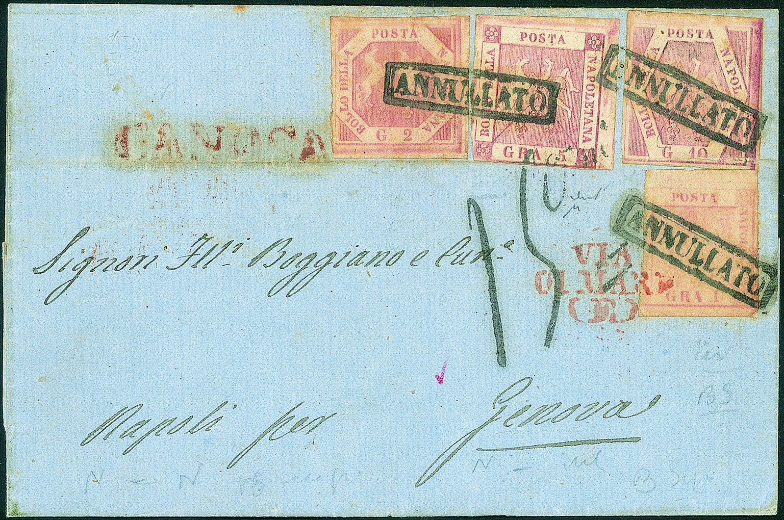 Diretta a Genova affrancata con 1 gr. rosa chiaro + 2 gr. rosa chiaro + 5 gr. rosa brunastro + 10 gr. rosa brunastro (3 + 5 + 8 + 10 cat. 1.900) con tassa 15 a tampone e bollo in rosso VIA DI MARE (E) posti in arrivo - con difetti ma interessante