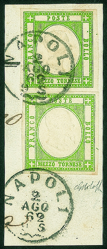 Antichi Stati Italiani - Province Napoletane - 1861 - 1/2 tornese verde + 1/2 tornese verde giallo (17 + 17c)Perfetti - usati su frammento Napoli 2 AGO 62 - bella combinazione di valori gemelli di ottima qualità - firma Giulio Bolaffi
