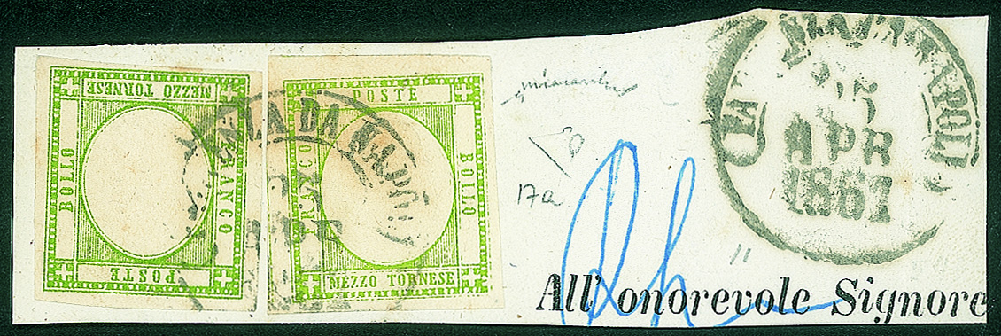 Lotto 35 | Antichi Stati Italiani - Napoli - Frammento affrancato con due esemplari del 1/2 tornese verde giallo chiaro e verde giallo (17a + 17e)