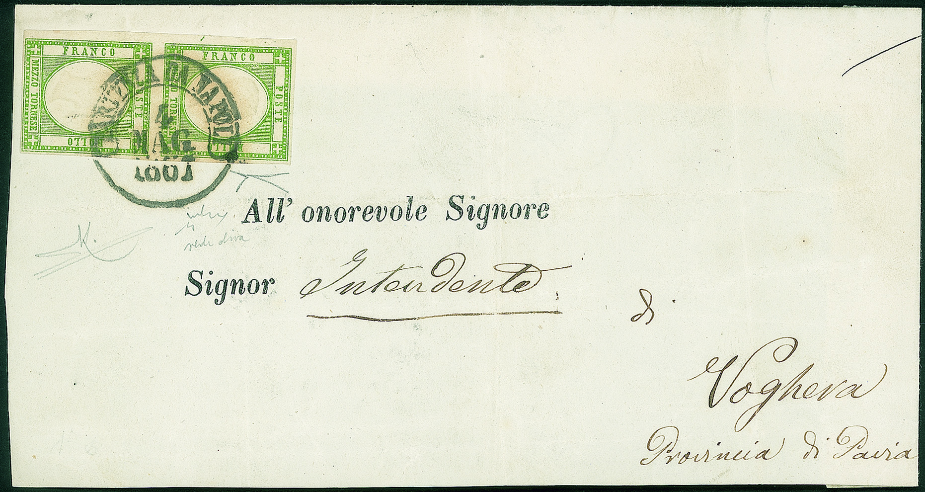 Lotto 37 | Antichi Stati Italiani - Napoli - Lettera affrancata con coppia verticale del 1/2 tornese verde oliva (17b cat.7000)