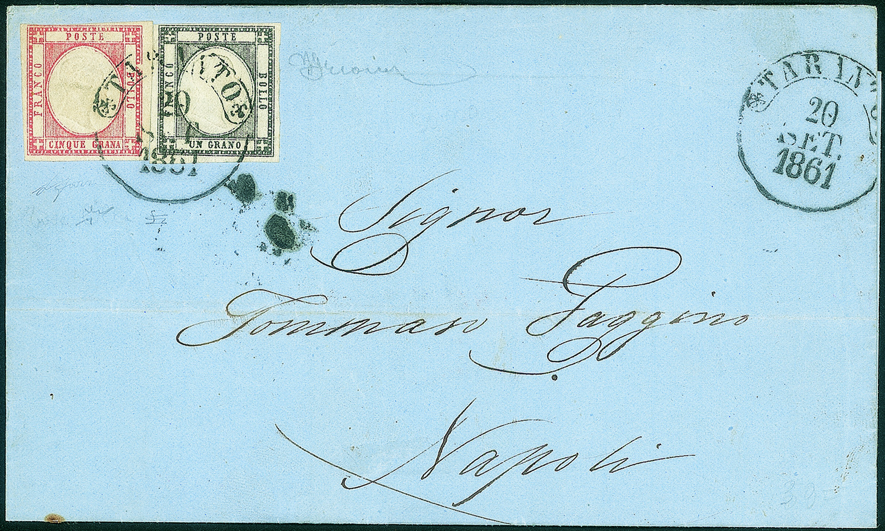 Antichi Stati Italiani - Napoli - Lettera con affrancatura bicolore composta da 1 grano nero + 5 grana rosa (19 + 21e cat.1800)Da Taranto 20 SET.1861 per Napoli - firma Chiavarello