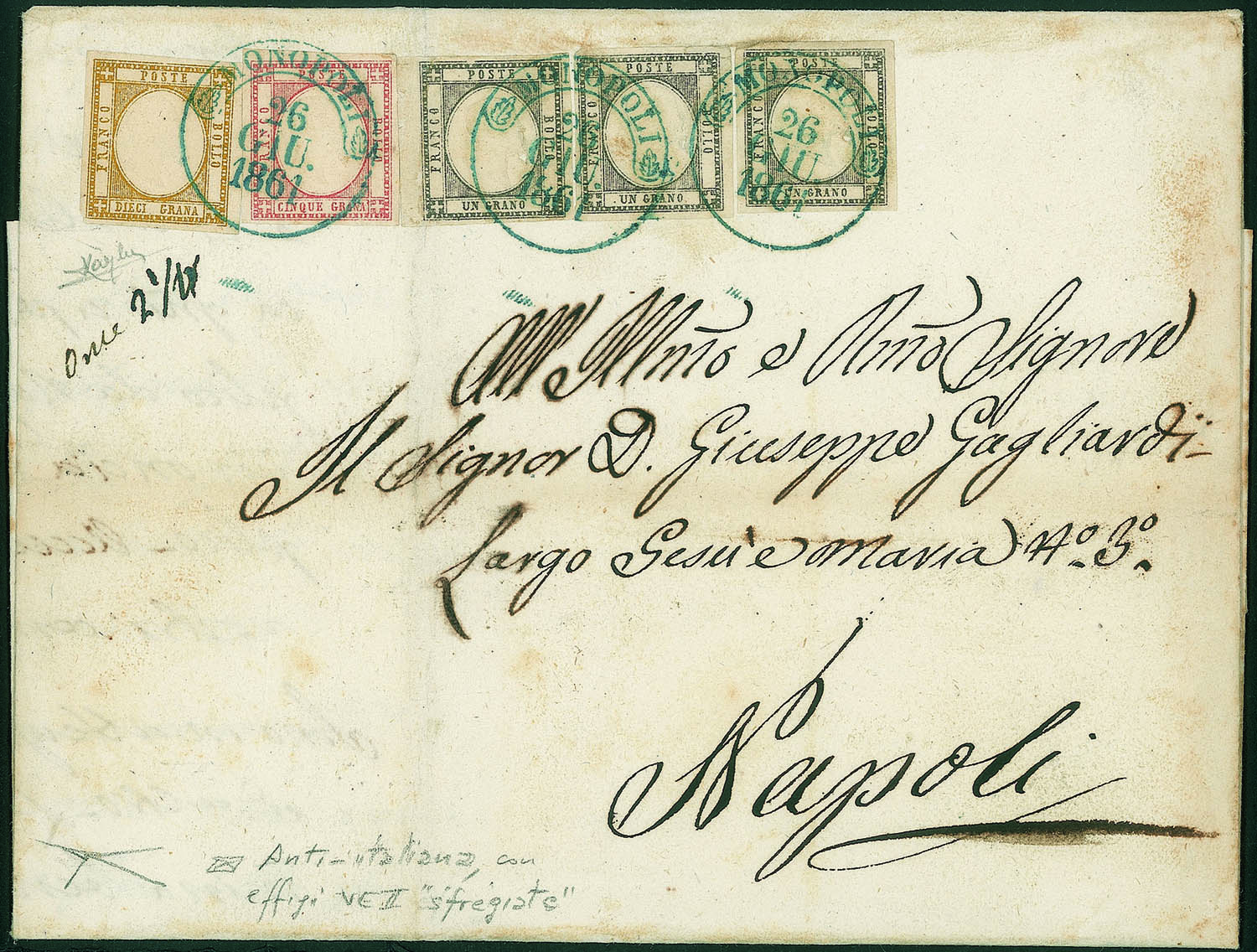 Antichi Stati Italiani - Province Napoletane - Lettera con affrancatura tricoloreCon 1 grano grigio scuro tre esemplari + 5 grana rosa + 10 grana giallo ocra (19a + 21e + 22a) da Monopoli 26 GIU.1861 per Napoli - Dal certificato Bottacchi: 'ai francobolli, in sfregio alla figura del monarca sabaudo (poco tollerato dai cittadini filo-borbonici), fu all'epoca grattata mediante apposita abrasione la barba delle effigi a rilievo che risultano così vilipese co chiaro intento anti-Sabaudo'