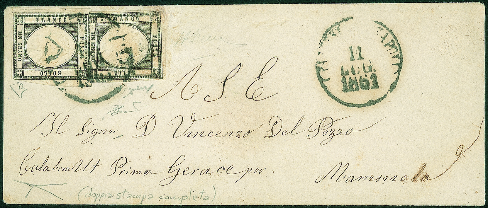 Antichi Stati Italiani - Napoli - Province Napoletane - Bustina (19cgc)Bustina affrancata con due esemplari del 1 grano nero con doppia stampa (19cgc) uno con doppia impressione parziale l'altro con doppia impressione completa da Napoli 11 LUG.1861 a Mammola - sul catalogo sassone è citato un solo valore usato con doppia stampa parziale - eccezionale oggetto iconico per le varietà delle province napoletane - cert. Bottacchi