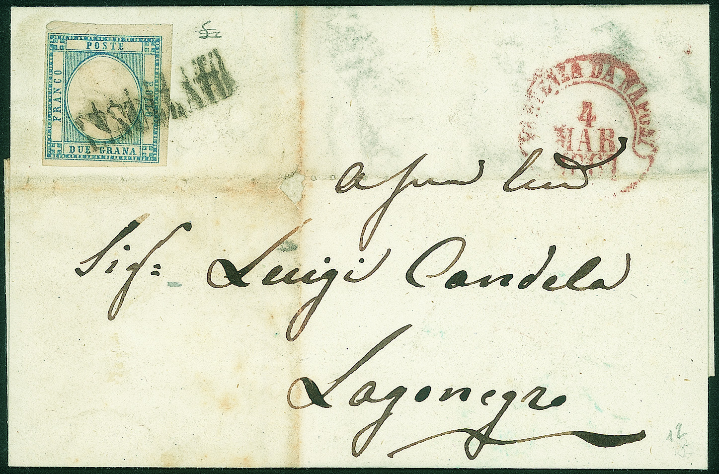 Antichi Stati Italiani - Province Napoletane - Lettera con bollo Annullato senza cartiglioSu 2 grana azzurro chiaro per Lagonegro con bollo Partenza da Napoli 4 MAR.1861 in colore rosso (20 P.ti12 cat.5500) - firma Luigi Gazzi