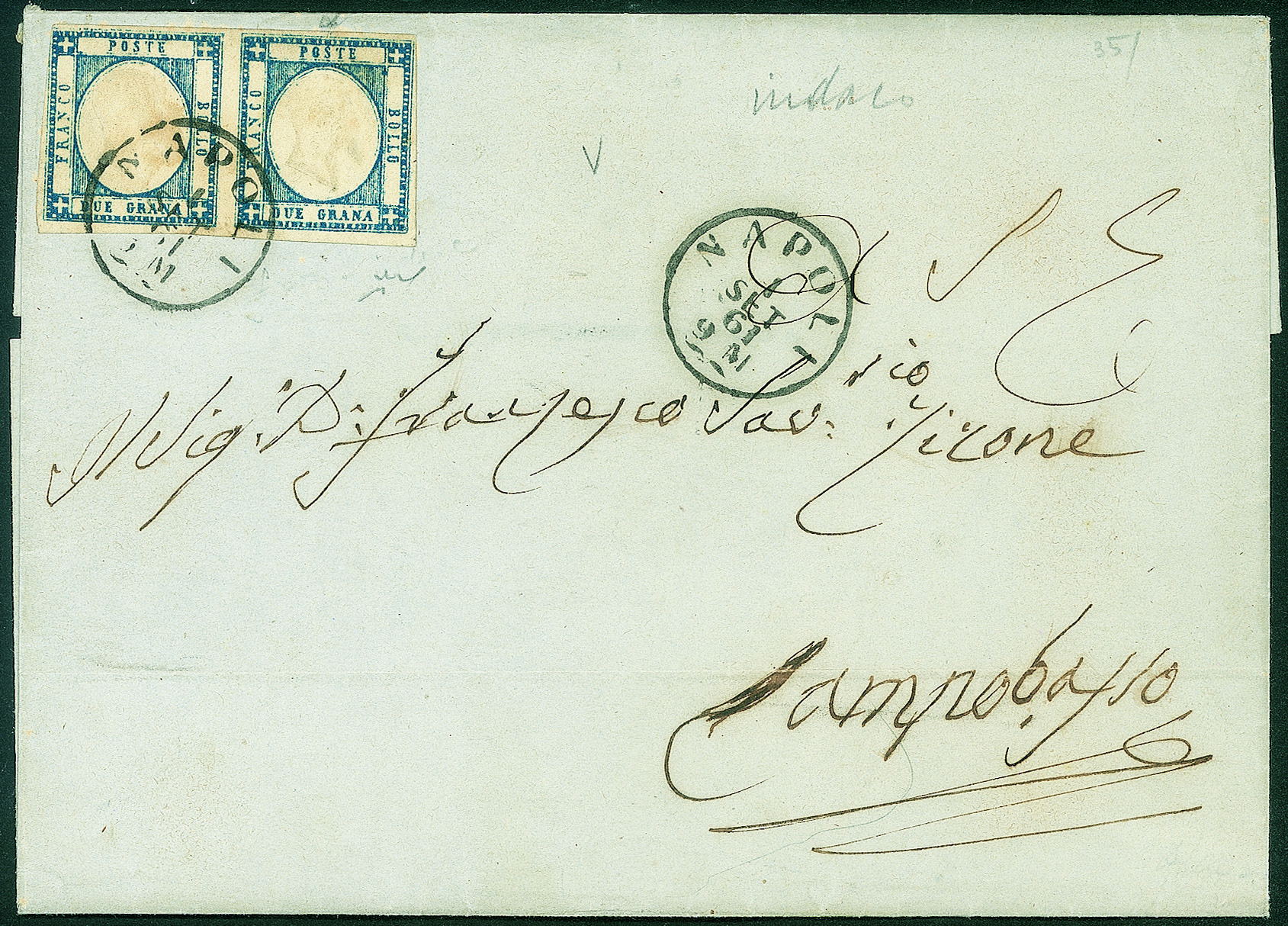 Antichi Stati Italiani - Province Napoletane - Lettera affrancata con coppia orizzontale del 2 grana indaco chiaro(20e cat.4400+) da Napoli 1 SETT 61 per Campobasso - firma Chiavarello