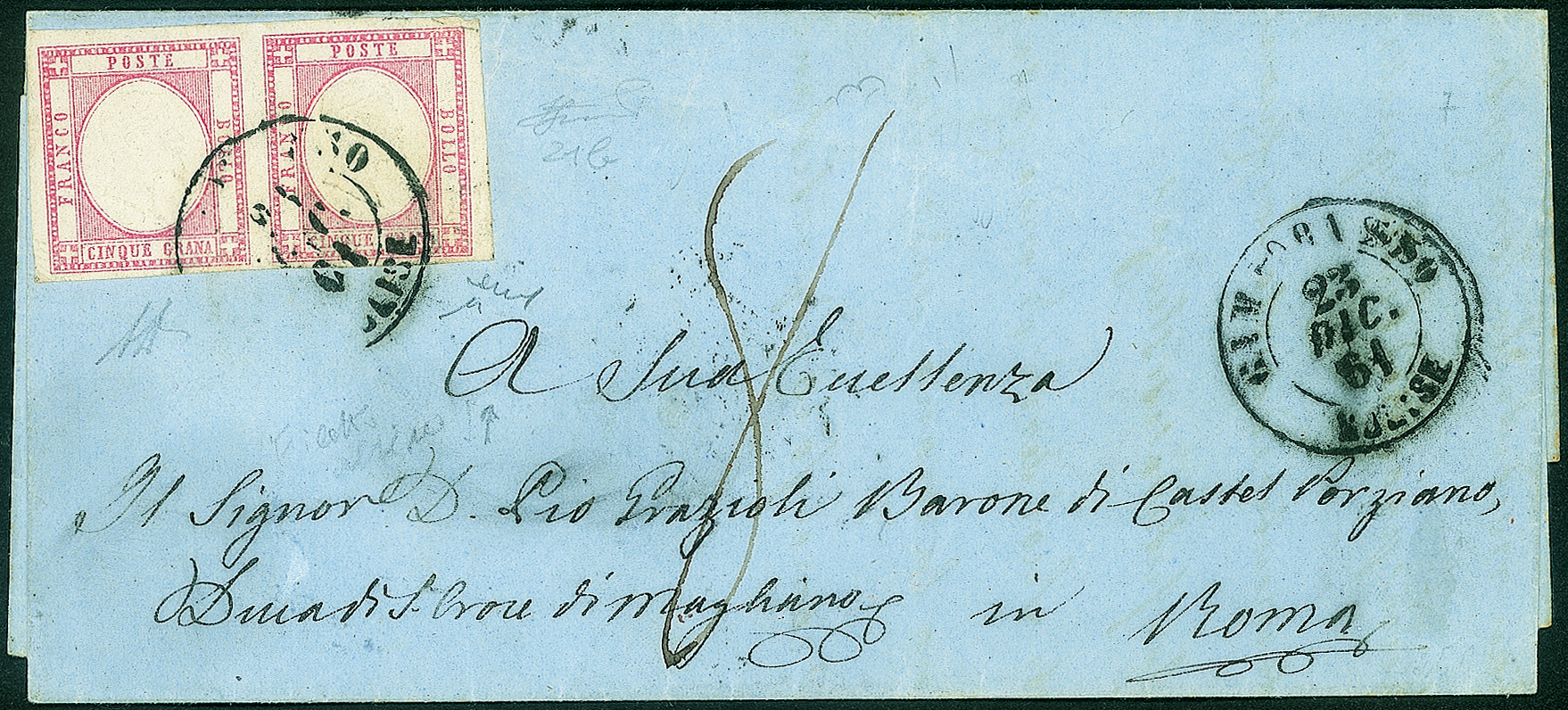 Antichi Stati Italiani - Province Napoletane - Lettera affrancata con coppia orizzontale del 5 grana rosa lilla (21b)Da Campobasso 23 DIC.61 per Roma con tassa 8 baj per l'inoltro a destino - firme Chiavarello + AD