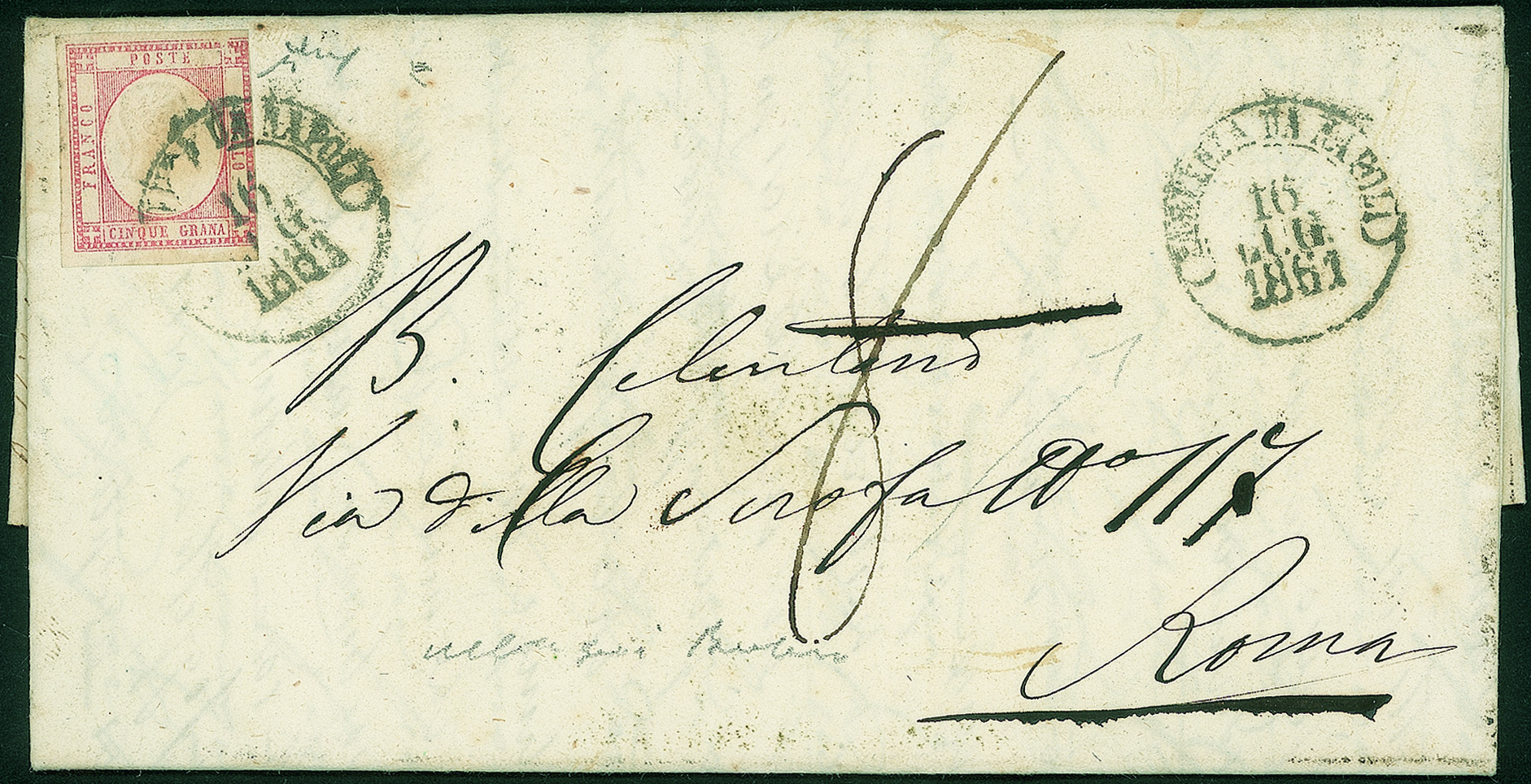 Antichi Stati Italiani - Province Napoletane - Lettera affrancata con 5 grana rosa lilla (21b cat.1650)Annullato Partenza da Napoli 16 LUG.1862 per Roma con tassa 8 manoscritta - firma Chiavarello