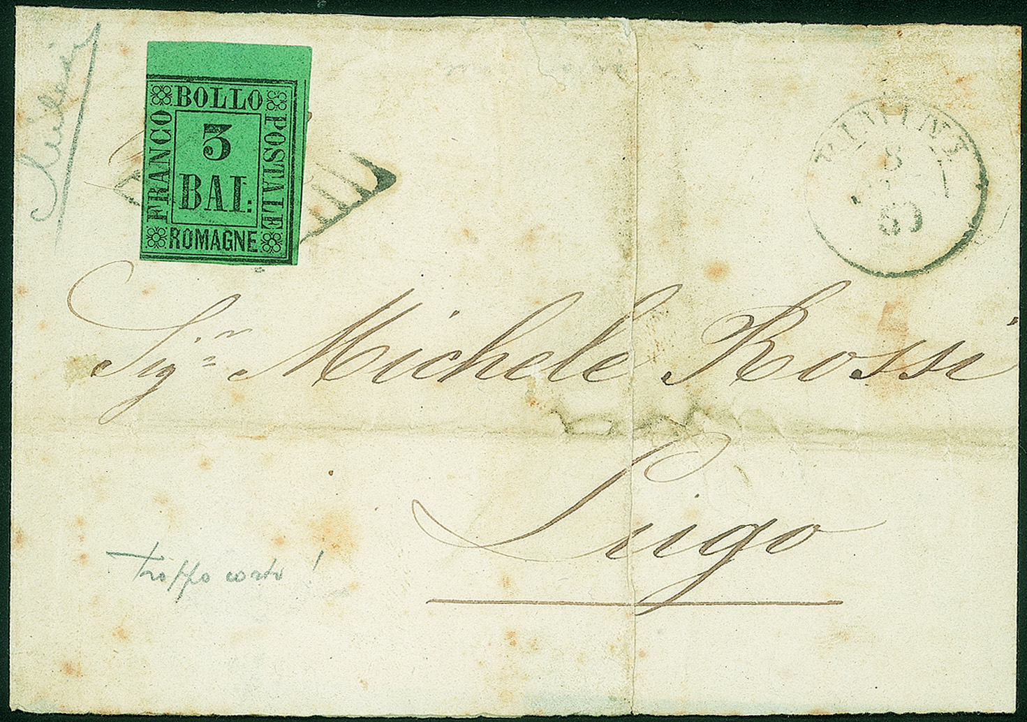 Antichi Stati Italiani - Romagne - Sopracoperta di lettera affrancata con 3 bai verde (4)