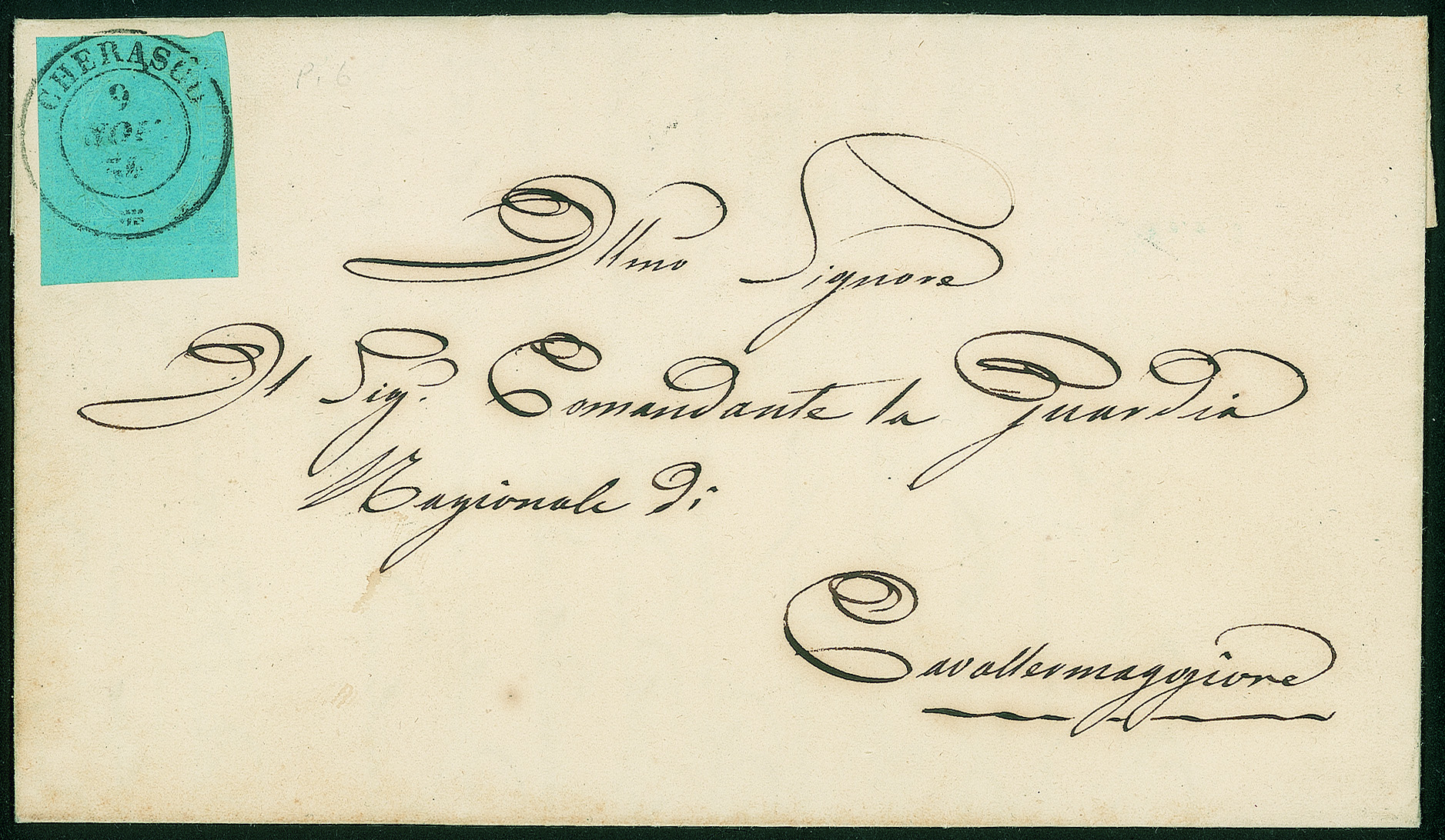 Antichi Stati Italiani - Sardegna - Lettera affrancata con 20 cent azzurro (5)Angolo di foglio inferiore sinistro - da Cherasco 9 NOV.54 per Cavallermaggiore