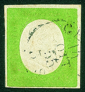 Antichi Stati Italiani - Sardegna - 1854 - 5 cent verde giallo con doppia impronta a secco (7f cat.3500)Usato con bollo di Genova - cert. Enzo Diena