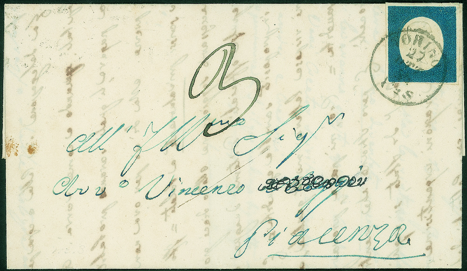 Antichi Stati Italiani - Sardegna - Lettera preconvenzione affrancata con 20 cent azzurro (8 cat.1350)Da Torino 27 OTT.54 a Piacenza con segno di tassa 3 per l'inoltro a destino - tagli di disinfezione - non comune per il ducato di Parma