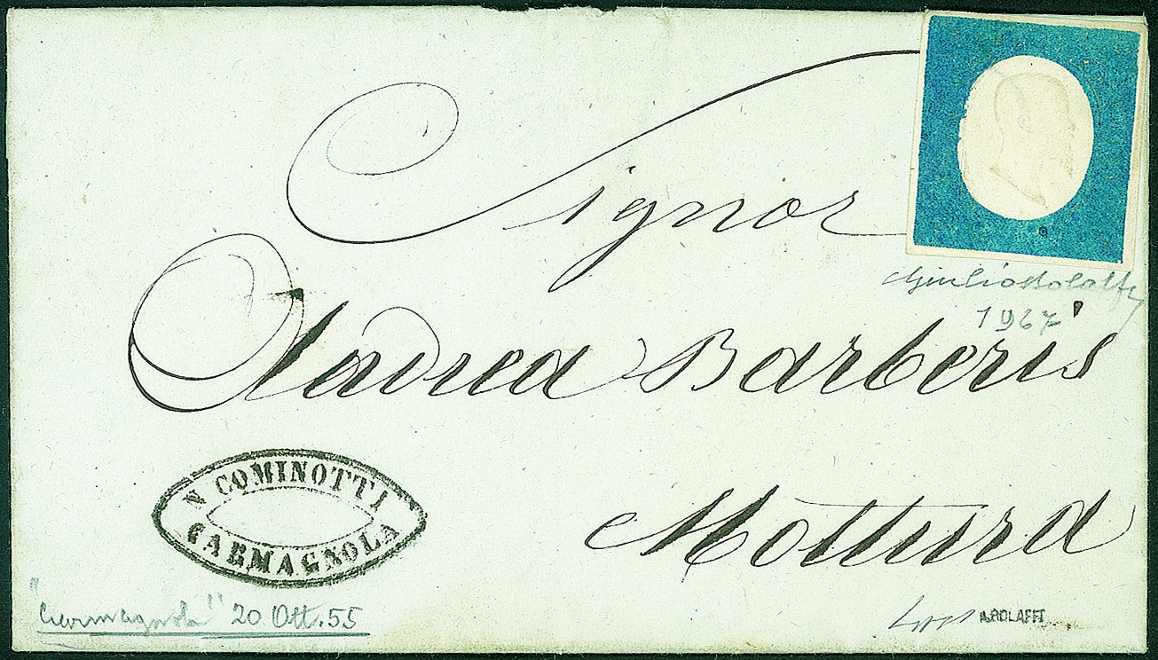 Antichi Stati Italiani - Sardegna - 1855 - 20 cent azzurro non annullatoSu busta da Carmagnola 20 ottobre 1855 per Mottura - cert. Giulio Bolaffi