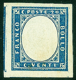 Antichi Stati Italiani - Sardegna - 1860 - 20 cent azzurro (15Ca)Gomma originale (con lievi ingiallimenti) - grandi margini - firme G. Bolaffi + AD
