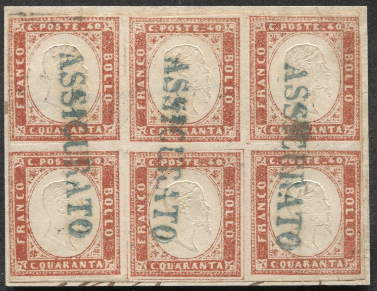 Antichi Stati Italiani - Sardegna - 40 cent (16Ac)Frammento recante un blocco di 6 del 40 cent vermiglio arancio scuro - margini in ordine - assicurato SD azzurro annullatore - RARITA' - Em.D + AD + cert. ED - (16Ac)