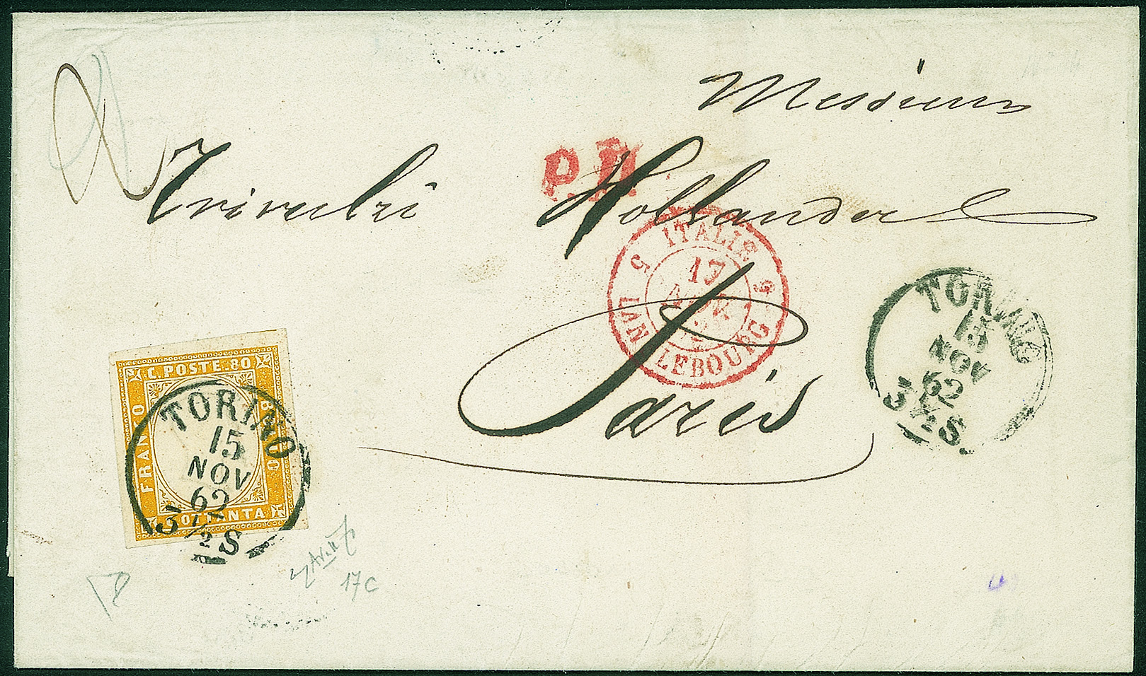 Antichi Stati Italiani - Sardegna - Lettera affrancata con 80 cent giallo arancio (17C cat.6375)Isolato da Torino 15 NOV 62 per Parigi - cert. Enzo Diena