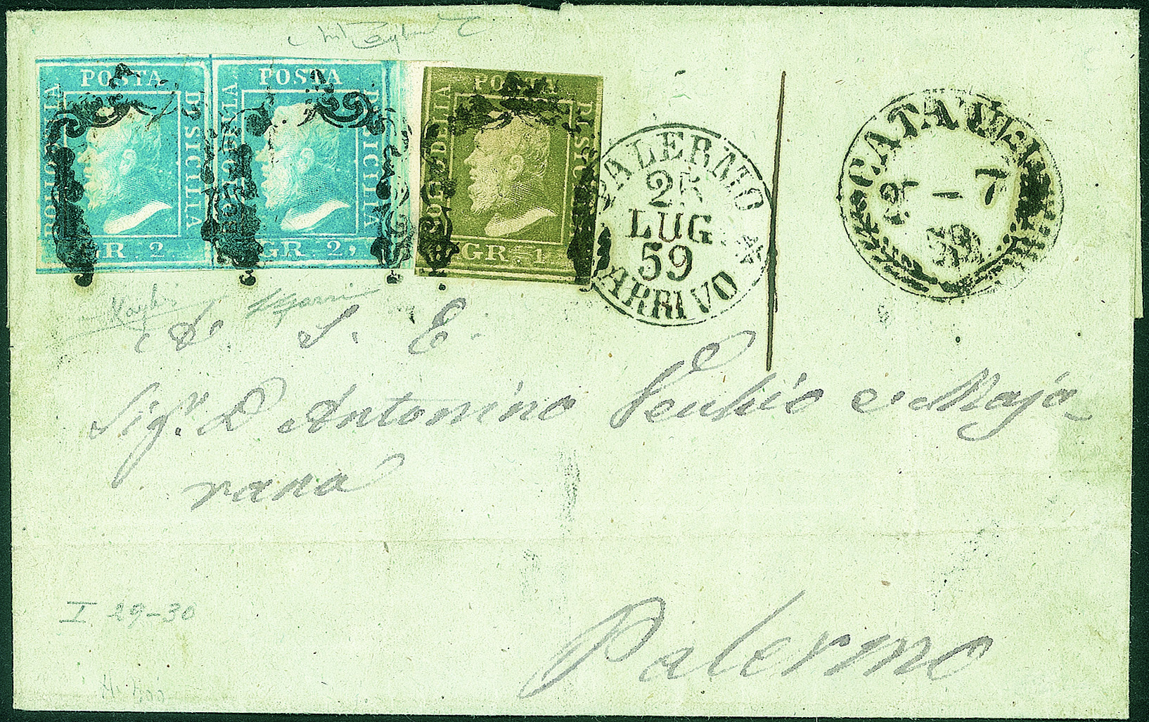 Antichi Stati Italiani - Sicilia - Lettera da Catania 25-7 59Affrancata con coppia del 2 grana azzurro smorto I tavola carta di Napoli + 1 grano verde oliva chiaro III tavola (6e + 5) per Palermo - cert. Raybaudi Luigi + Maurizio