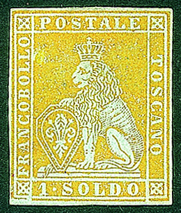 Antichi Stati Italiani - Toscana - 1851 - 1 soldo (2a cat.45000)1 soldo giallo limone su azzurro (2a cat.45000) - nuovo con gomma parziale - leggermente difettoso ma di ottimo aspetto - cert. Enzo Diena + Bolaffi