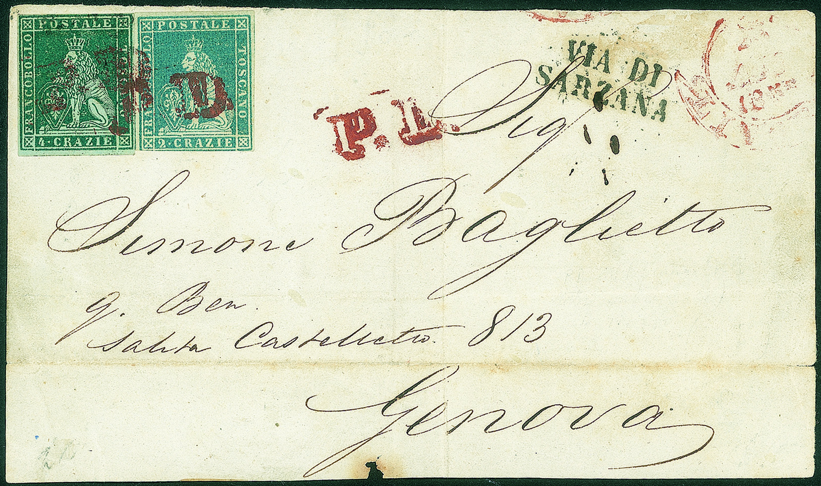 Antichi Stati Italiani - Toscana - Frontespizio di lettera affrancato con 2 crazie azzurro chiaro su grigio + 4 crazie verde su grigio (5+6 cat.1250)Entrambi annullati con bollo P.D. in rosso per Genova