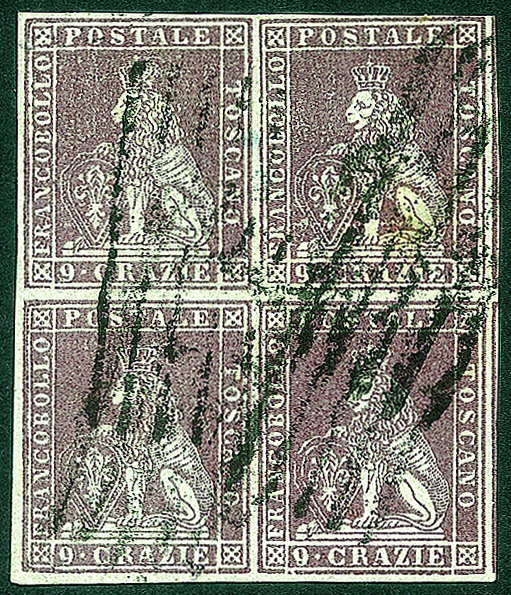 Antichi Stati Italiani - Toscana - 1851 - 9 crazie (8 cat.22000)9 crazie Marzocco viola bruno su grigio in quartina (8 cat.22000) - usato con ottimi margini sui quattro lati - cert. Enzo Diena