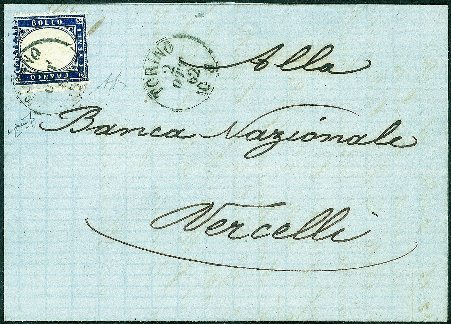 Regno - Vittorio Emanuele II - Lettera affrancata con 20 cent indaco (2nfa)Con varietà francobollo più corto con 13 denti verticali anziché 14 - da Torino 2 OTT 62 per Vercelli - varietà di gran pregio - cert. Avanzo