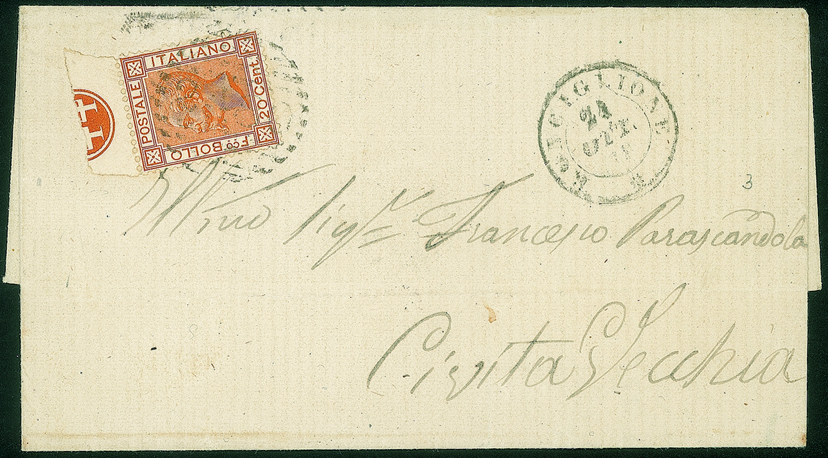 Regno - Vittorio Emanuele II - Lettera affrancata con 20 cent arancio (28) Bordo di foglio con parziale numero di tavola 44 in cerchio (numero non conosciuto al Serra-Zanaria) da Ronciglione 21 OTT. 78 per Civitavecchia
