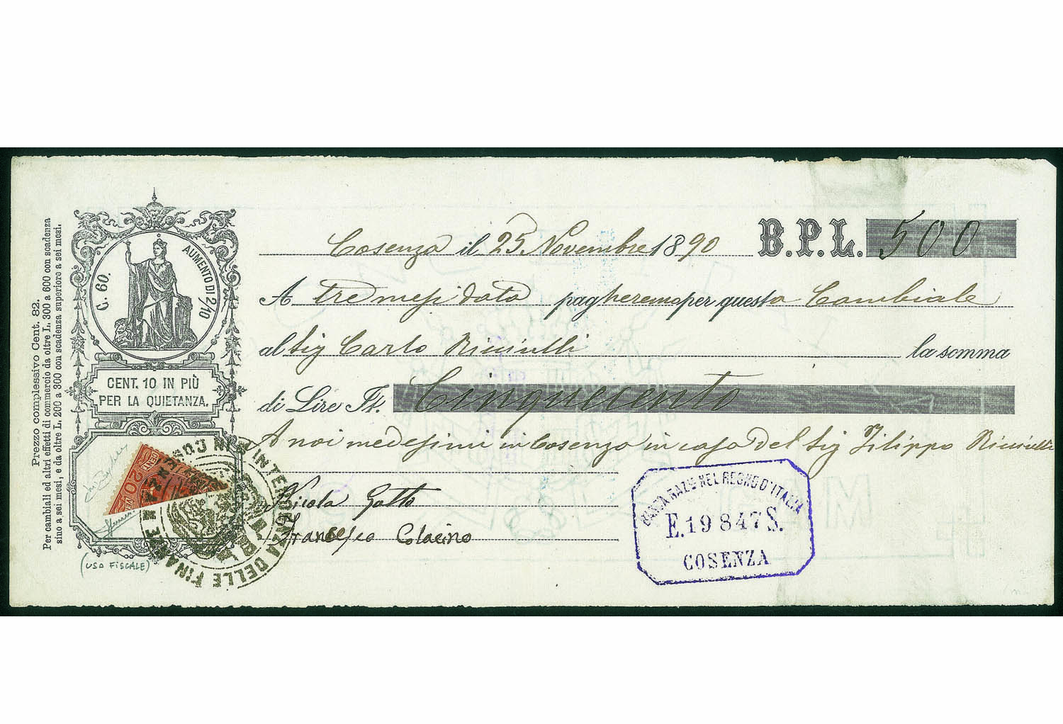 Regno - Umberto I - 20 cent arancio Umberto I (61)Frazionato in diagonale e utilizzato fiscalmente su cambiale del 25 novembre 1890 con annullo amministrativo dell'Intendenza di Finanza di Cosenza - rarità - firme Sorani + Raybaudi